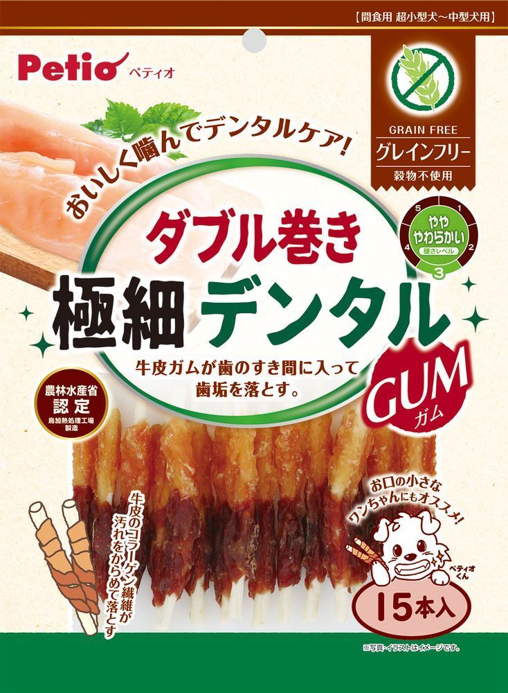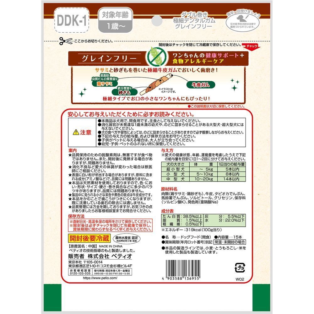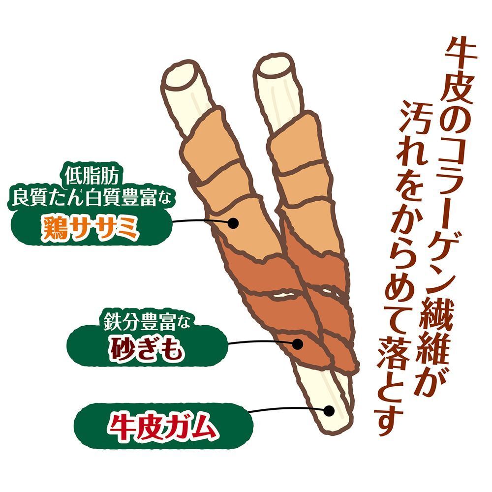 ワンちゃんの健康サポート+食物アレルギーケア。ササミと砂ぎもを巻いた極細牛皮ガムでおいしく歯磨き!極細タイプでお口の小さなワンちゃんにもピッタリ!低脂肪・良質たんぱく質豊富な鶏ササミ。鉄分豊富な砂ぎも。着色料 不使用。