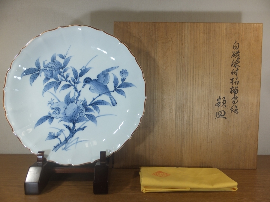 | 説明 | 佐賀県出身の陶芸家で人間国宝 井上萬二の『白磁染付柘榴鳥絵額皿』本人策 無傷 共箱 共布付です。 状態は良好です。 このままで飾って楽しめますし、使用しても楽しめます。 高台内に「萬二作」と銘があります。 真白で美しい白磁の地に、口縁部を輪花に形造り、見込みに柘榴と鳥を描いた、 大変綺麗で上品な額皿です。 縁起の良い図柄ですので、贈り物としても最適です。 コレクターの放出品です、画像で御確認下さい。 皿立ては、撮影の為に使用した物で、作品には付帯致しません。 ★九州地方の買出し品です。 買出したままでの出品です、御入札宜しくお願い致します。 入札は早めにお願い致します。 一人でも入札があれば梱包作業に入りますので、素早い発送が可能です。 早期終了あり。 井上萬二は、 昭和後期-平成時代の陶芸家。 昭和4年3月24日生まれ。 佐賀県出身。 12代酒井田柿右衛門, 初代奥川忠右衛門に師事し、 昭和46年独立。 白磁の伝統技法を駆使し,独自の作風を確立した。 44年,58年アメリカで作陶を指導。 平成7年白磁で人間国宝。 9年有田陶芸協会会長。 日本工芸会参与。 |