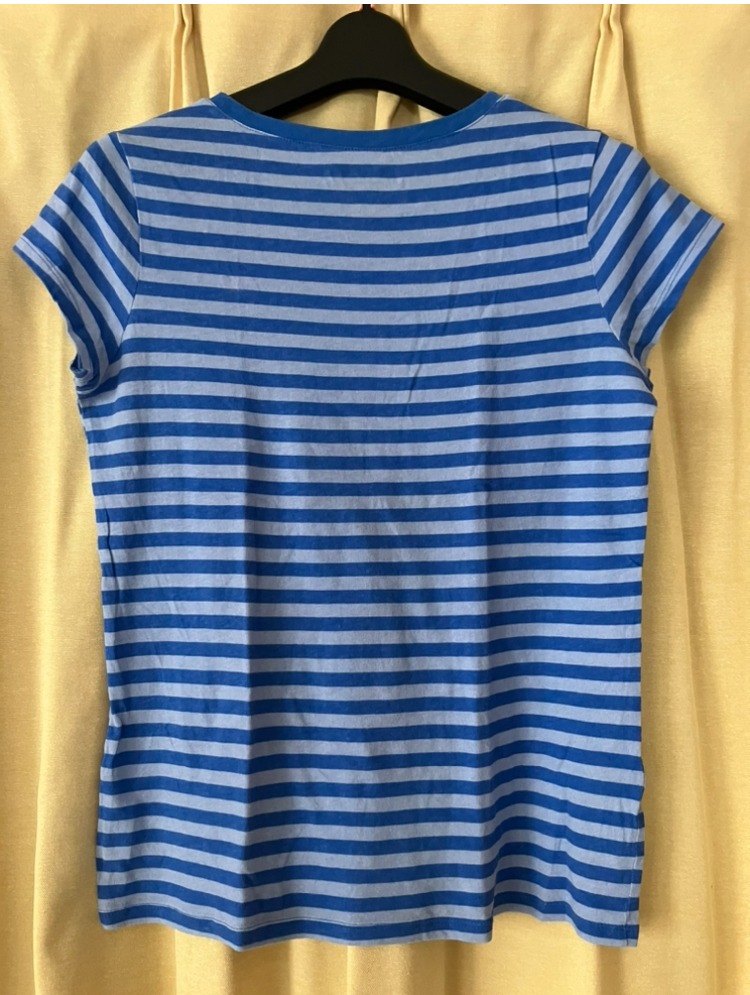 ブルー系のボーダーの襟が緩やかなVになっているさわやかなTシャツです。