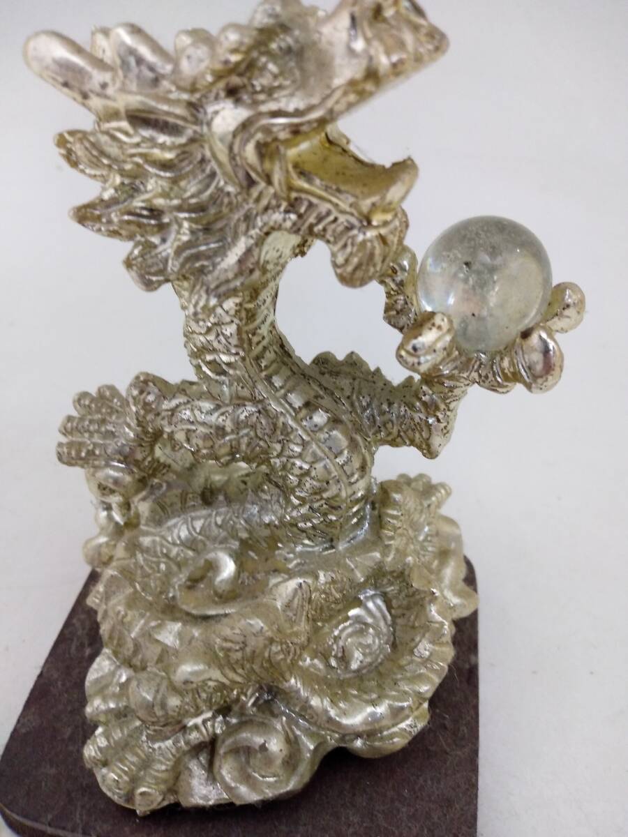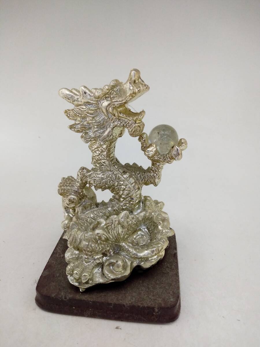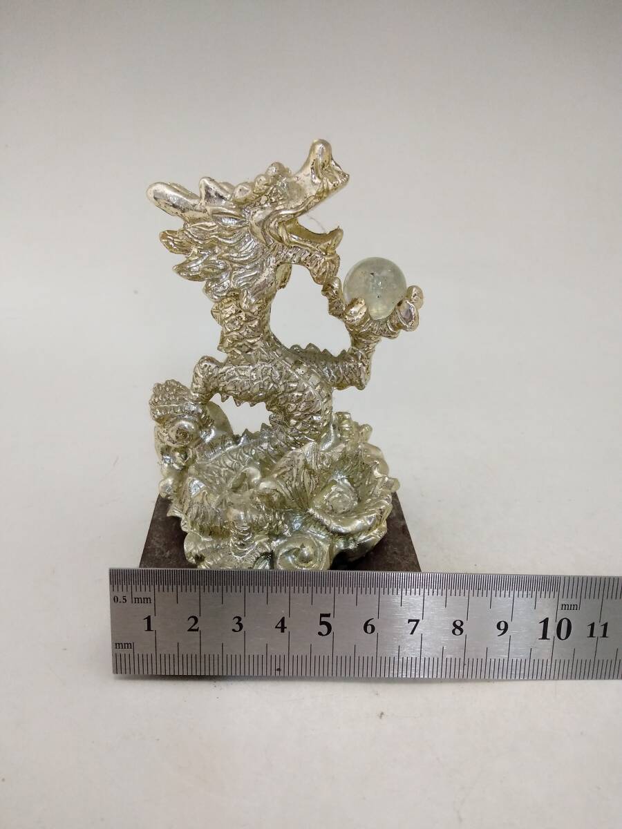 0129-0009 中古★銀龍 ドラゴン 置物 金属製 水晶? オブジェ 風水 開運 和風 レトロ