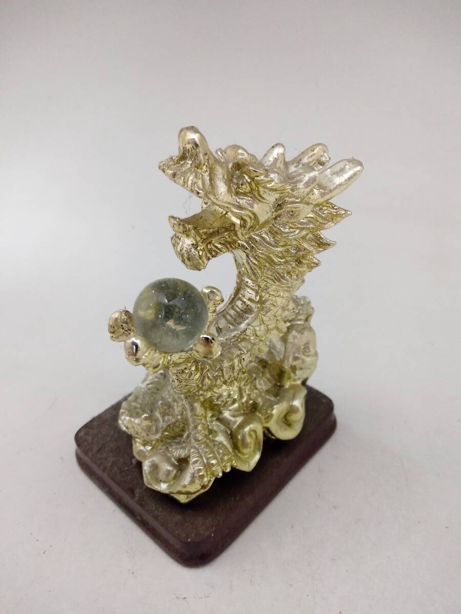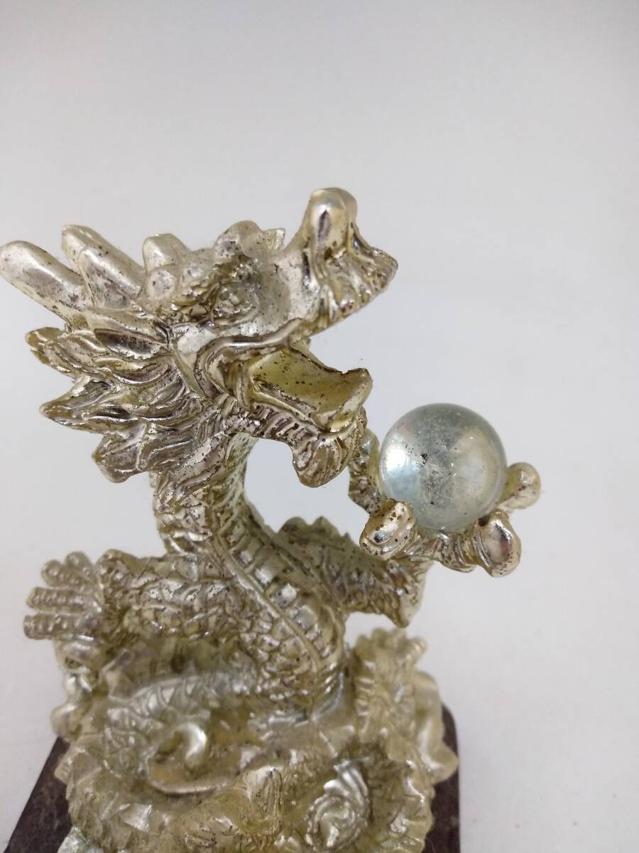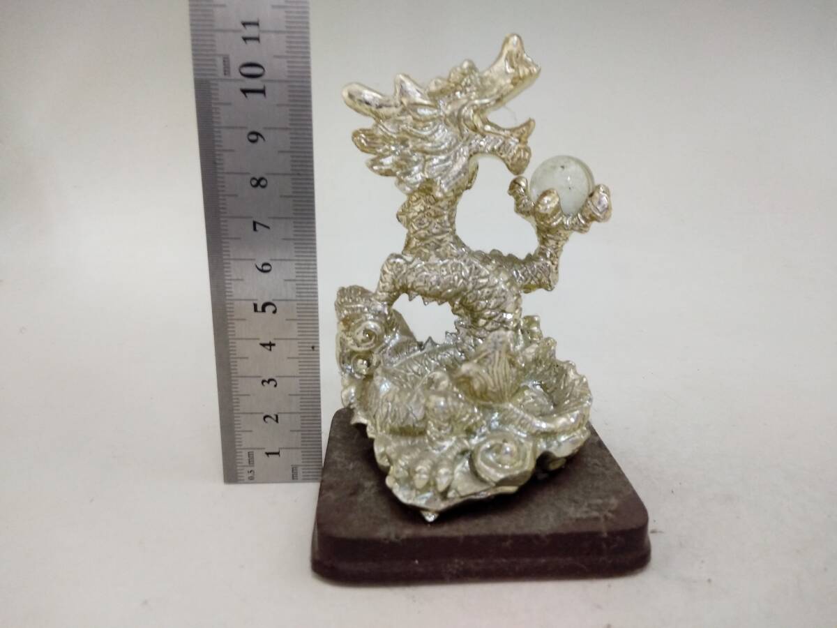 0129-0009 中古★銀龍 ドラゴン 置物 金属製 水晶? オブジェ 風水 開運 和風 レトロ