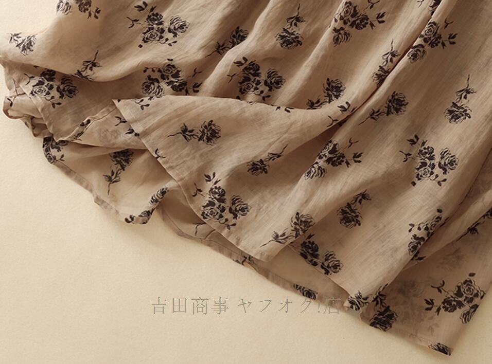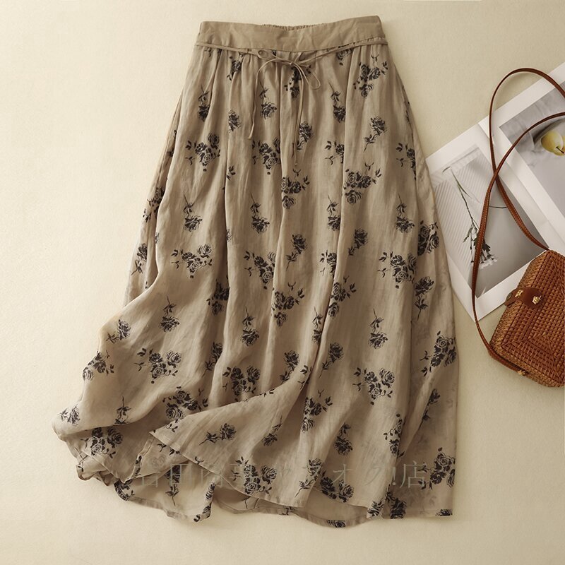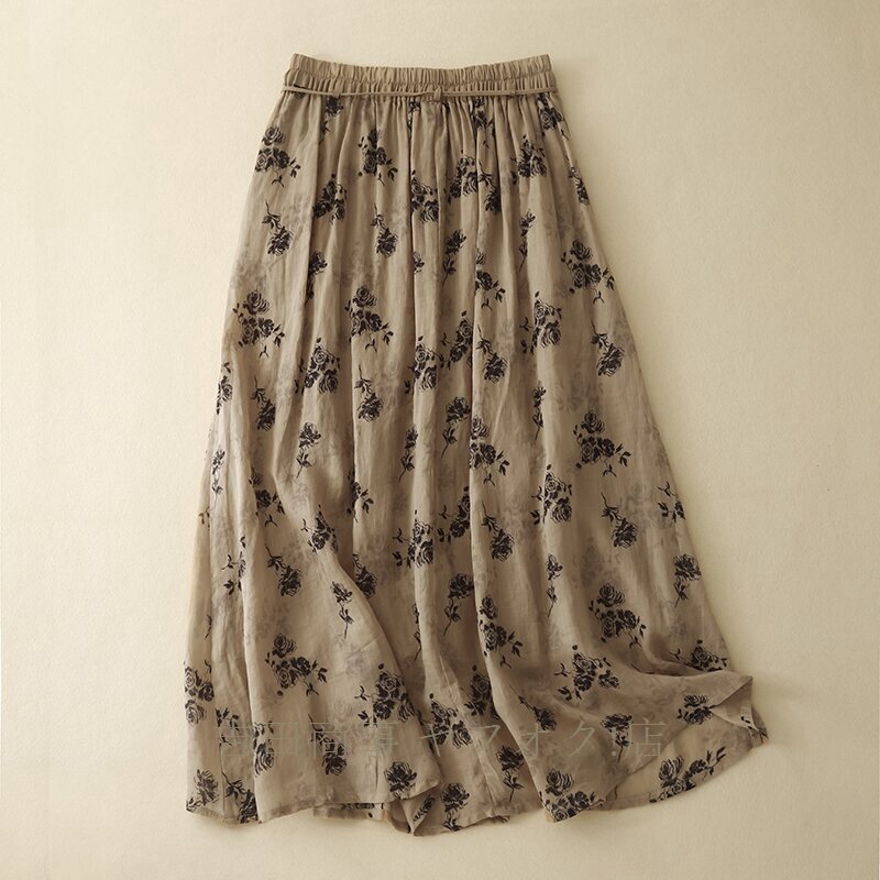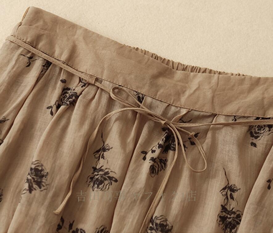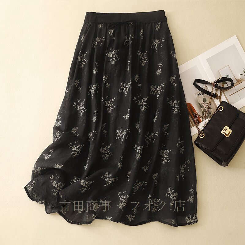 A1048☆新品フレアロングスカート 花柄スカート ミモレ丈スカート かわいい 美脚効果スカート ウエストゴム Aラインスカート ブラック