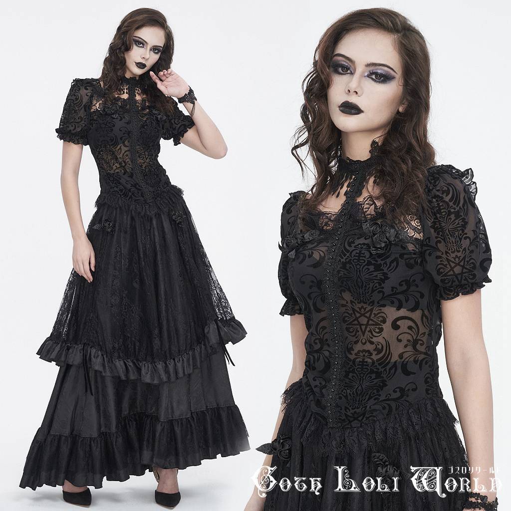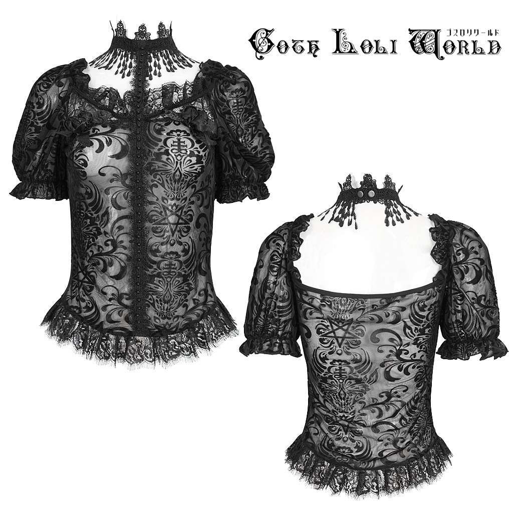 TT268-XS-S デコルテ柄入りシースルー背中開きチョーカー カットソー 黒色 ゴスロリワールド ゴシック パンク ロリィタ ビジュアル系 V系