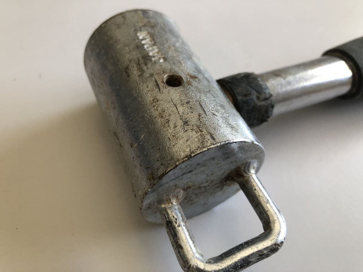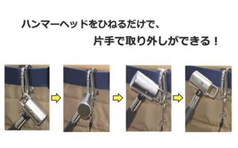 ハンマーヘッドをひねることにより、片手でカラビナ工具差しから取り外すことができる。