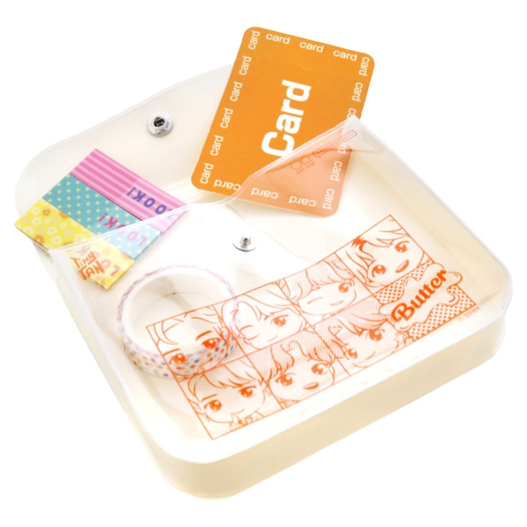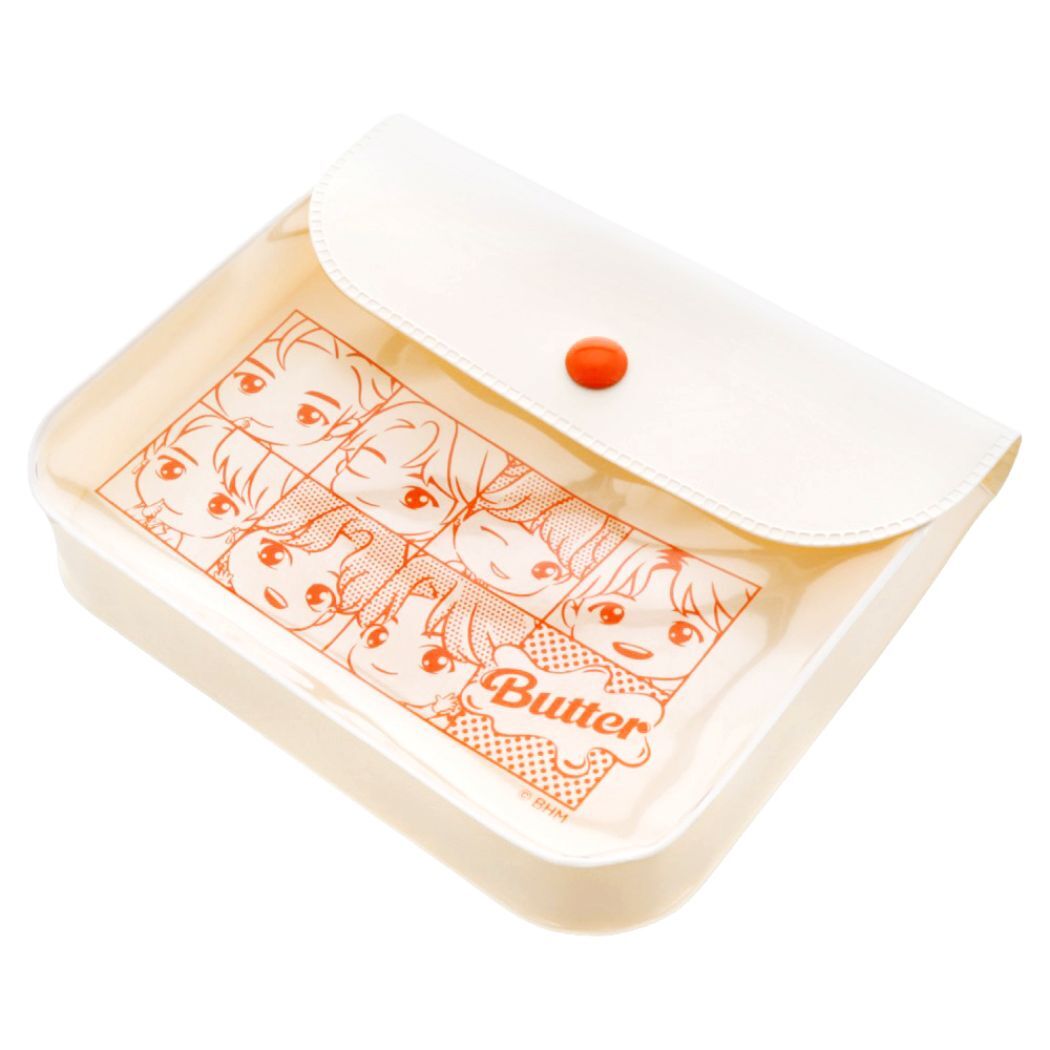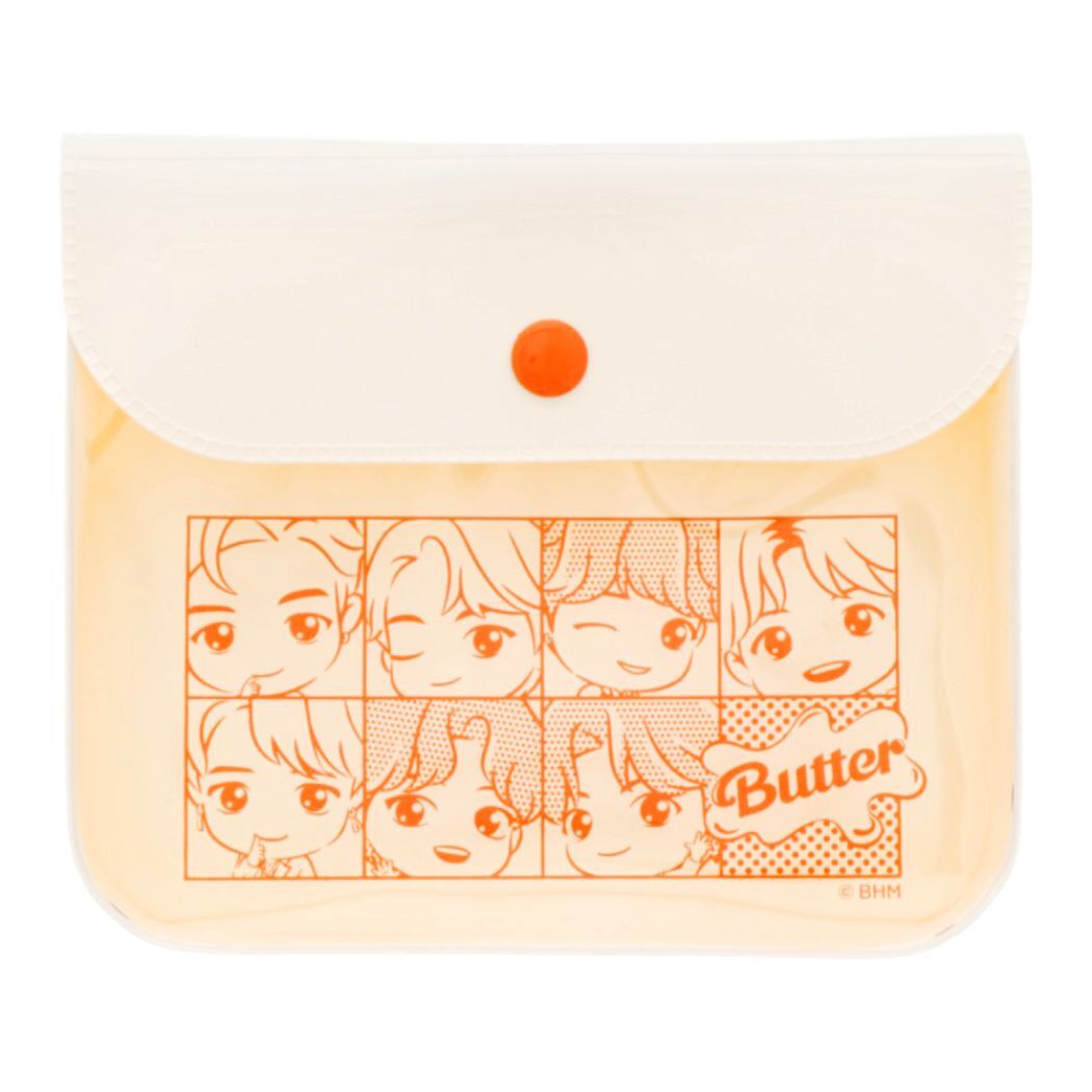 TinyTANのステーショナリートータル企画第3弾 世界中で大人気[TinyTAN/タイニータン]大ヒット曲のButterをイメージしたポップなデザインのステーショナリーシリーズですこちらはちょっとした小物が入れられて便利な[ミニポーチ]表面はクリア素材なので中が見えてとってもかわいい同シリーズの文具いろいろあるのでお気に入りを揃えてくださいサイズ:約125x100x20mm素材:PVC