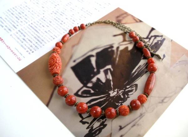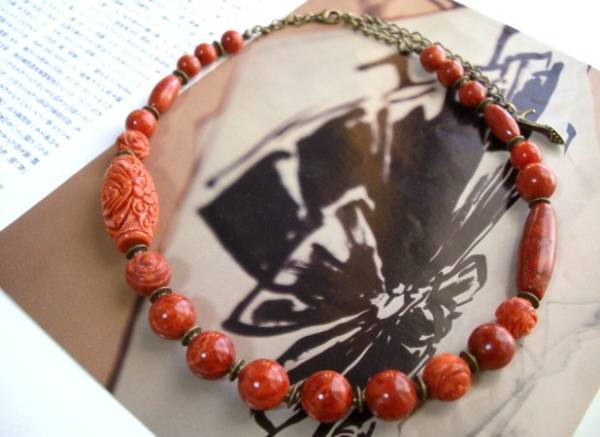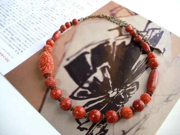 女の子・スタイル・・シリーズです♪クラッシックな赤・・深い赤のスポンジ珊瑚のネックレスです♪丸玉やナツメや薔薇彫りなどデザイン違いの珊瑚を集めてロマンチックな表情です♪8ミリ、10ミリ、12ミリの丸玉やナツメ、薔薇彫りの珊瑚にシックな座金を合わせました♪長さは40センチ+アジャスター12センチで最長52センチ位です♪チョーカー風にされても素敵です♪お揃いのブレスレットも出品しています♪♪シンプルで長く着けていただけるデザインを考えて作りました♪ハンドメイドをご理解頂いて ノークレーム、ノーリターンでお願いします