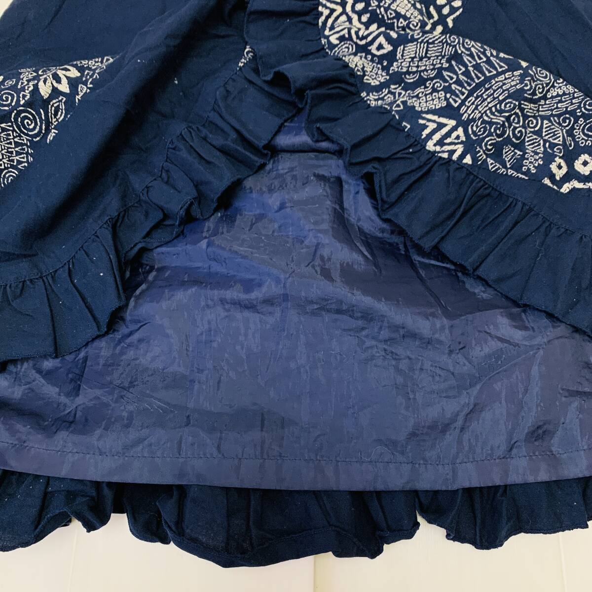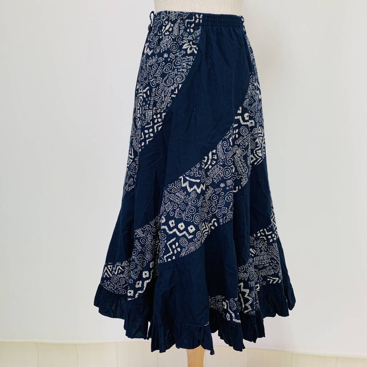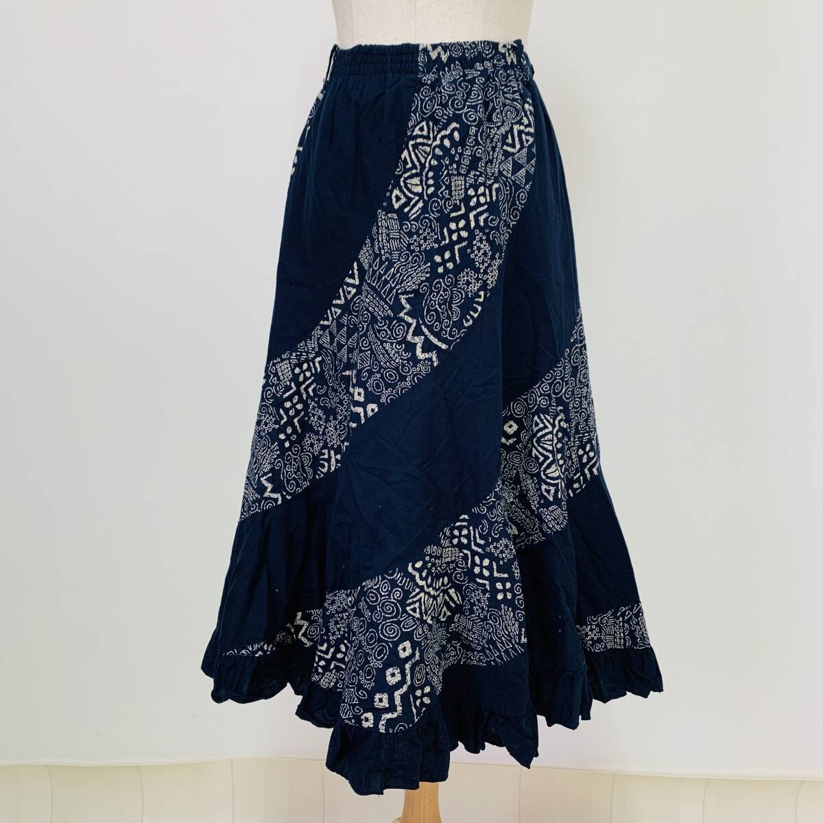 YH1231 日本製 レディース ひざ下丈 スカート 総柄 Aライン ベルト穴り ウェストゴム フリル 薄手 W64~74サイズ ネイビー 紺 万能 USED