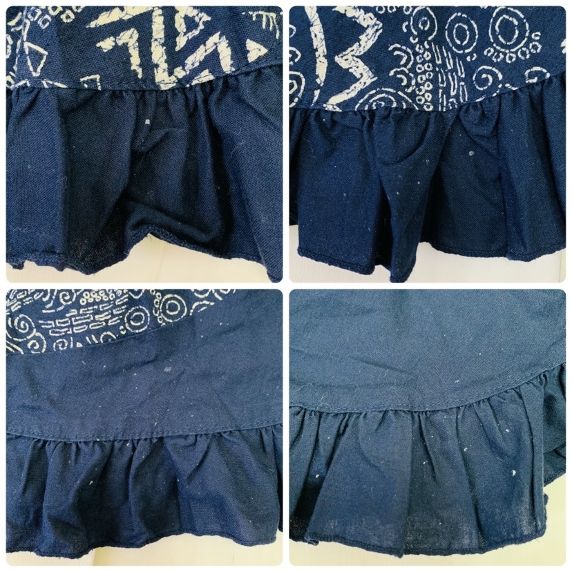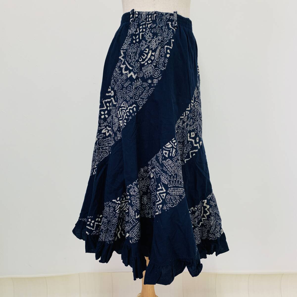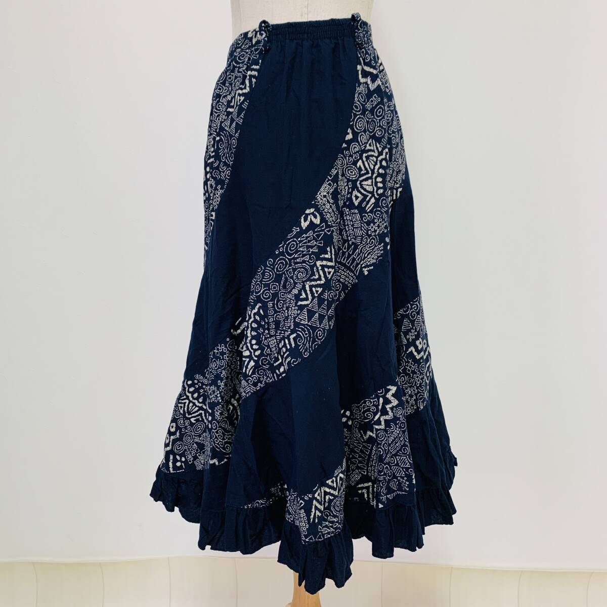 YH1231 日本製 レディース ひざ下丈 スカート 総柄 Aライン ベルト穴り ウェストゴム フリル 薄手 W64~74サイズ ネイビー 紺 万能 USED