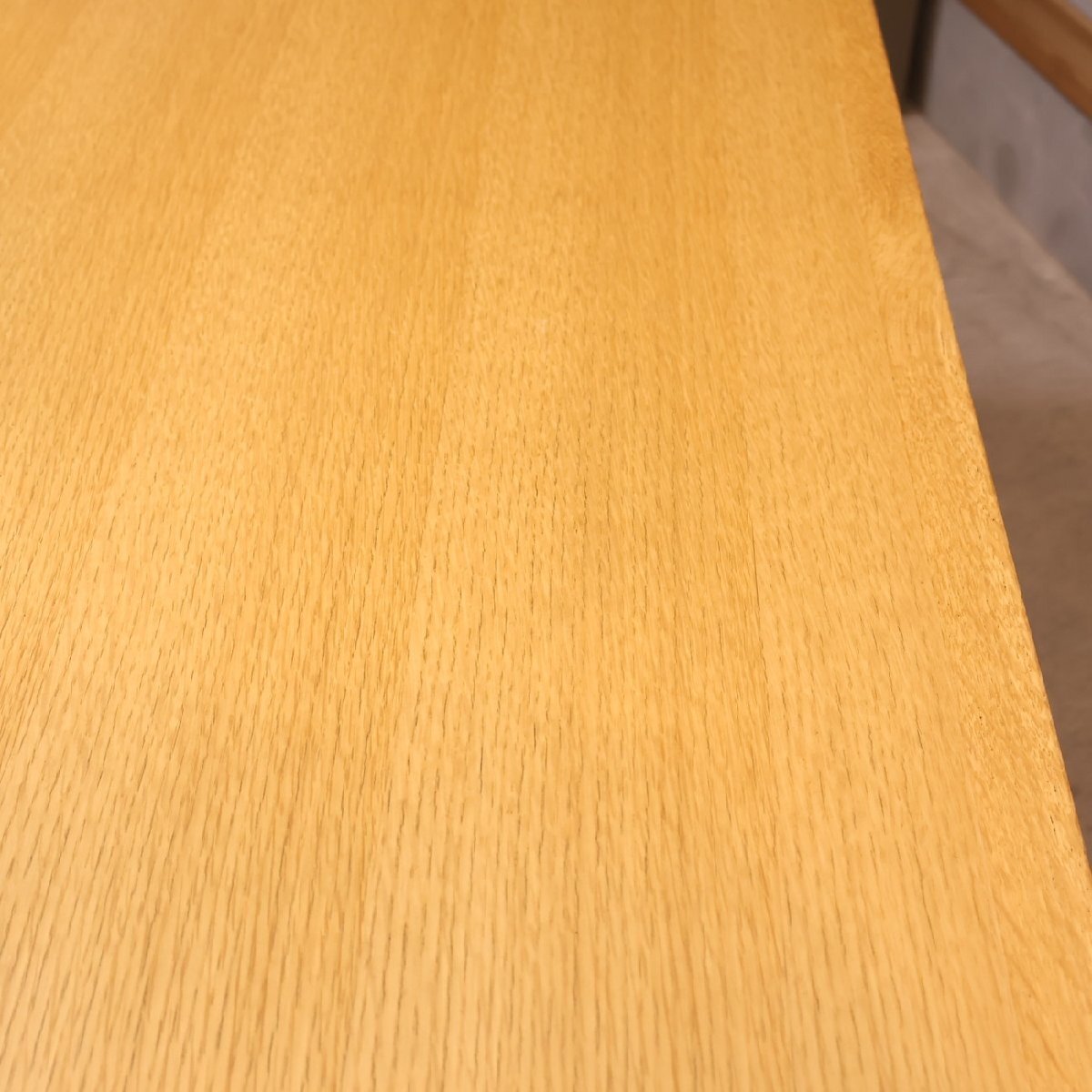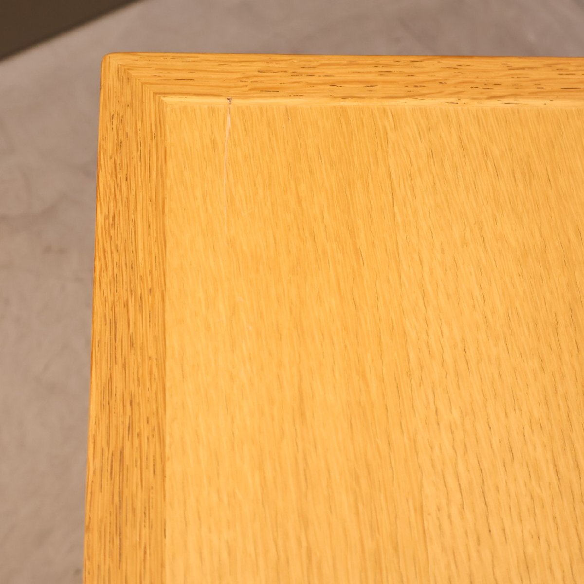 天板にはナラ材の木目を楽しめる突板を、また天板の縁に無垢材を使用することで