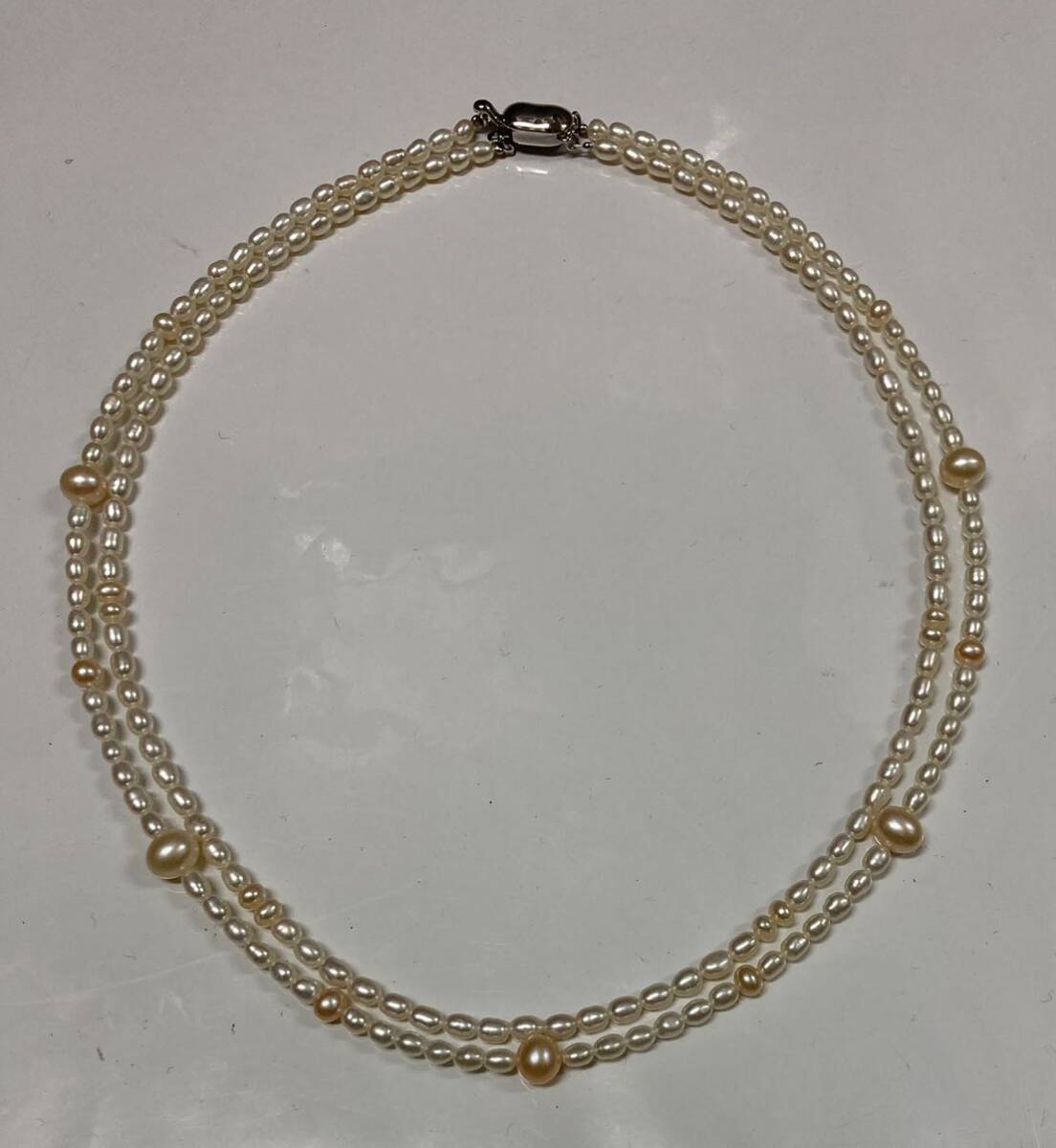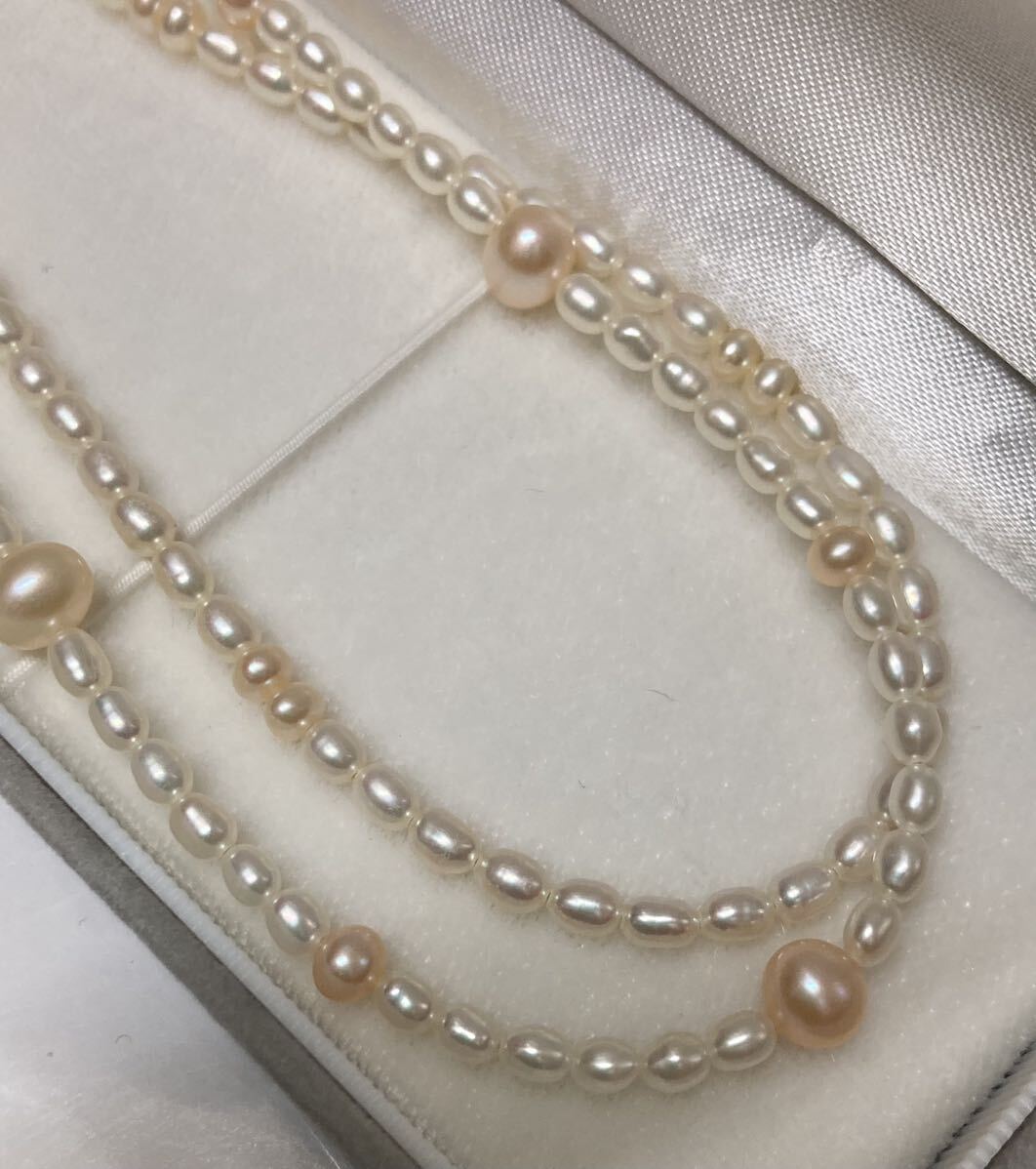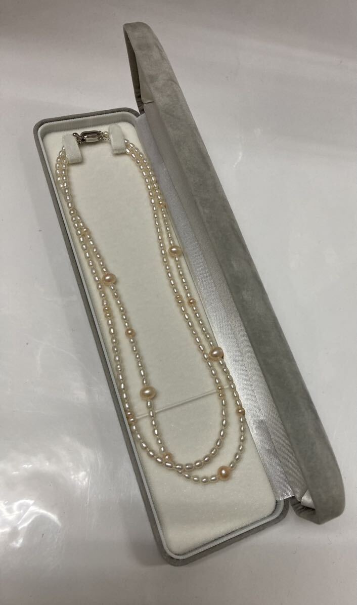 アコヤ 真珠 パール 二連 ネックレス ♪ SILVER 刻印 全長:約41cm 本真珠 ケース付 ライスパール 真珠 あこや ライス ピンク×ホワイト