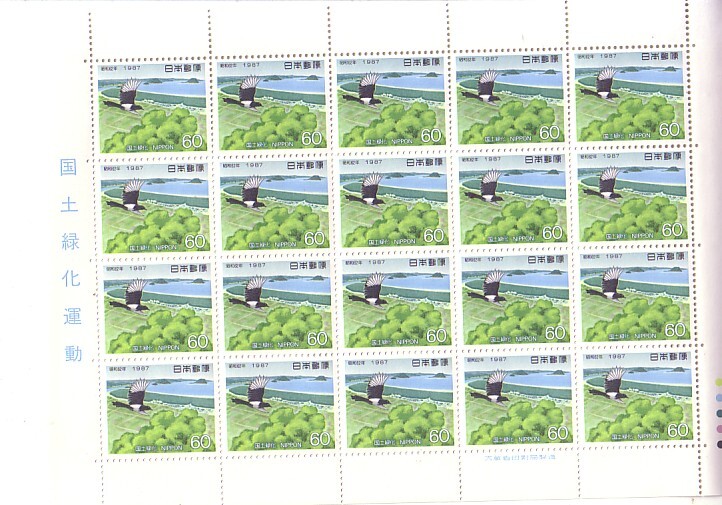 「国土緑化運動 昭和62年」の記念切手です (60円切手X20枚)。送料は普通便140円(郵送 複数落札でも同一料金)になります。