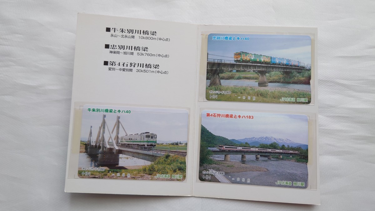 ■JR北海道旭川駅■鉄橋とキハ 忠別川橋梁とキハ40ほか■記念オレンジカード1穴使用済3枚組台紙付