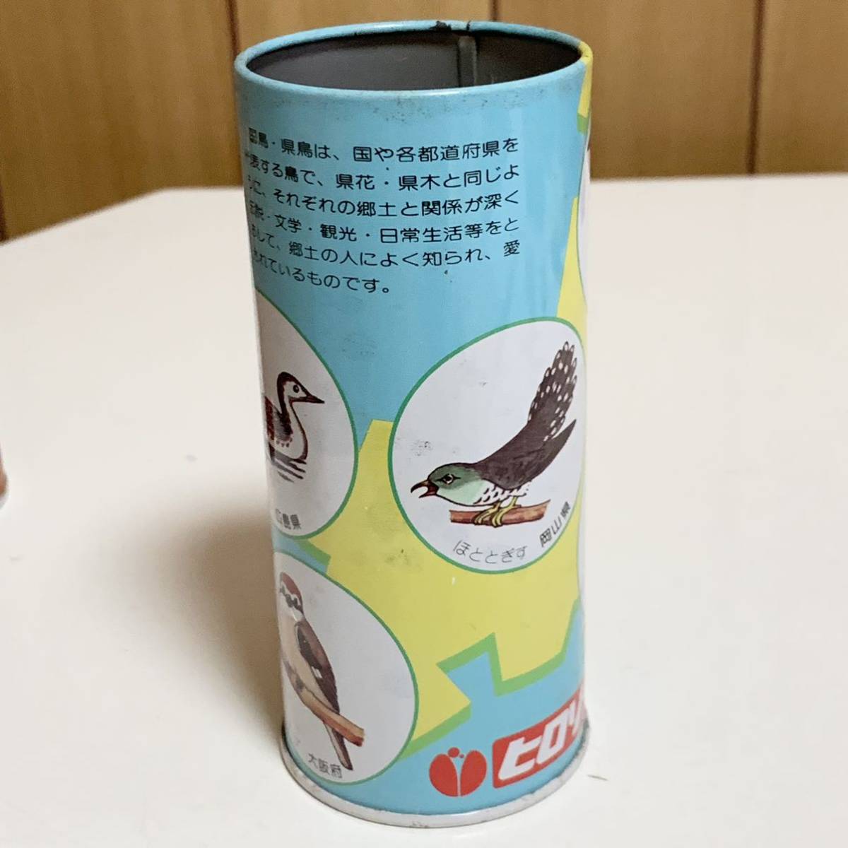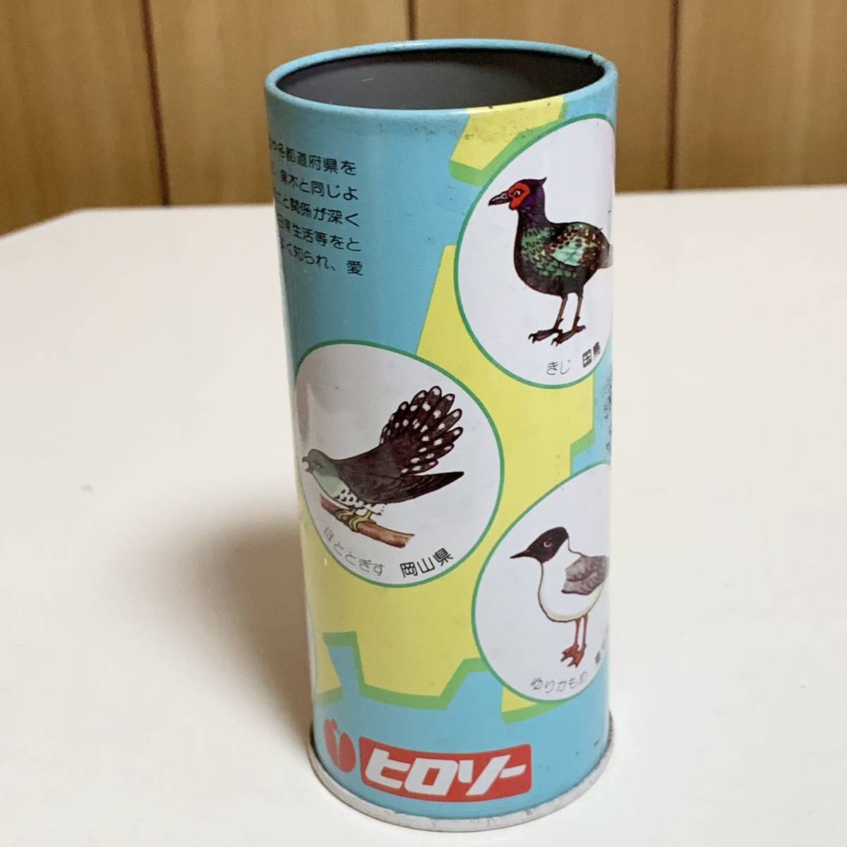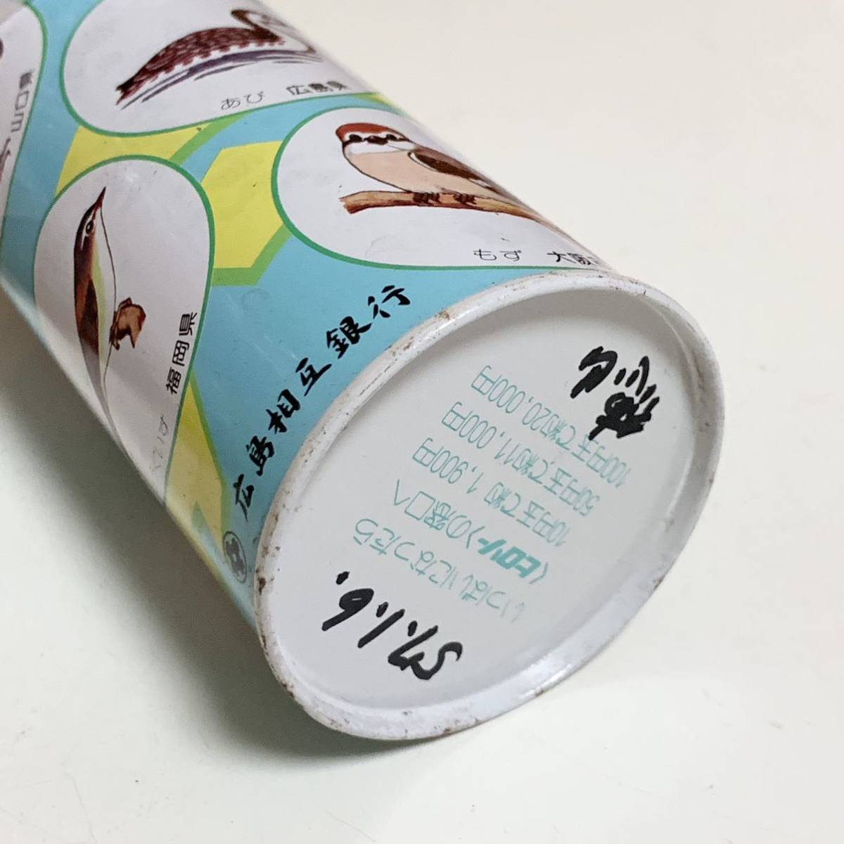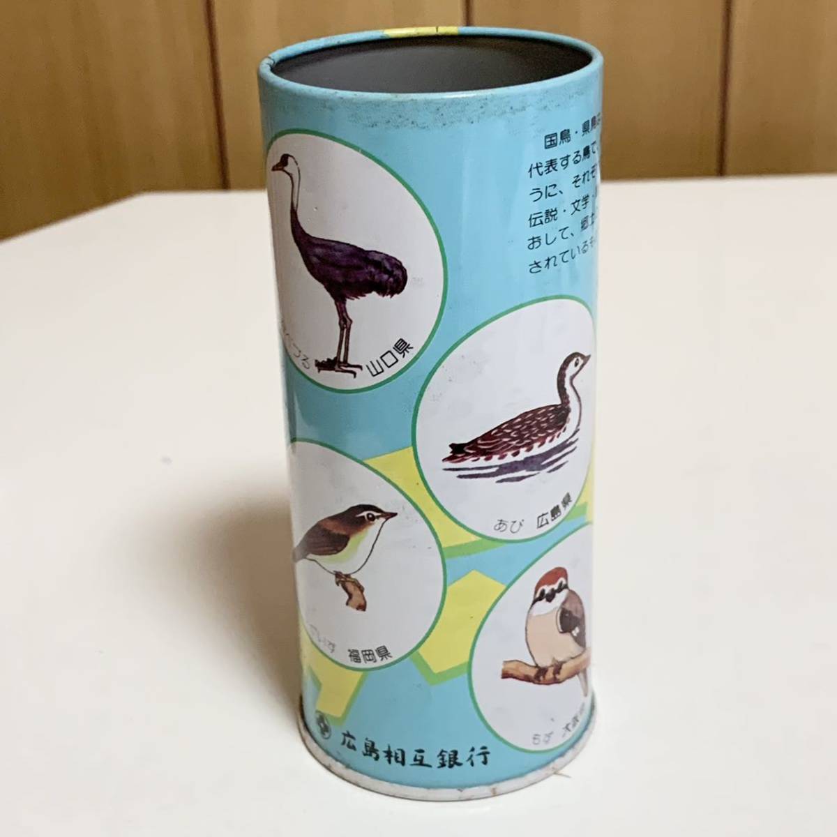 中国地方を中心とした県鳥、国鳥のイラストや地図のプリントされた、広島相互銀行の貯金箱。