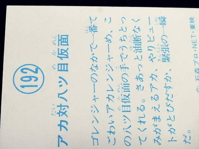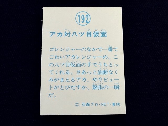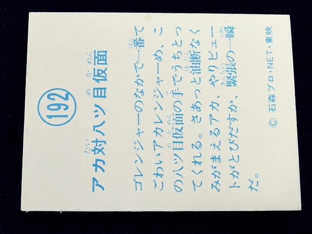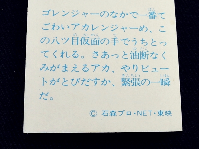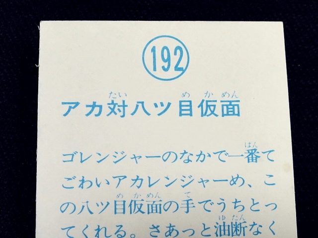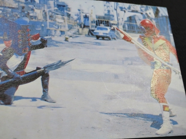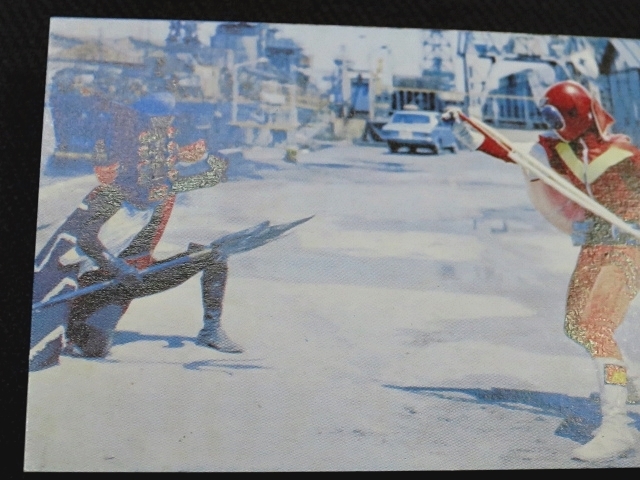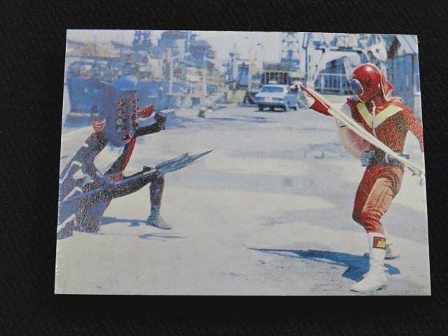 秘密戦隊ゴレンジャー ミニカード 70年代 バラ売り ・メーカー:山勝 ・1975年頃、当時の放送時に販売 ・6.6 cm x 5.0 cm ・同梱発送可能(複数落札の場合:定形、定形外郵便は、送料が変わる場合があります。) ・1-288番シリーズ ・1弾80種 001-080(タイトル違い.55.57.59.61.71.76.77,表修正.73) ・2弾32種 081-112 ・3弾64種 113-176 ・4弾48種 177-224 ・5弾32種 225-256 ・6弾32種 257-288 〓参考項目〓 ・原作:石森章太郎 ・脚本:上原正三 他 ・監督:竹本弘一 他 ・制作:テレビ朝日 ・放送期間:1975年4月- 1977年3月 ・全84話 〓出演〓 ・海城剛・アカレンジャー:誠直也 ・新命明・アオレンジャー:宮内洋 ・大岩大太・キレンジャー:畠山麦 ・熊野大五郎・2代目キレンジャー:だるま二郎 ・ペギー松山・モモレンジャー:小牧りさ ・明日香健二・ミドレンジャー:伊藤幸雄 ・江戸川総司令:高原駿雄 ・陽子・007:鹿沼えり ・黒十字軍総統:安藤三男、八名信夫 ・ナレーション:田中信夫、大平透 | ||