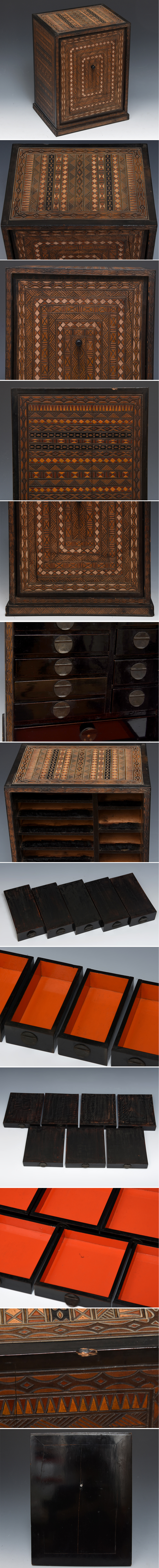 オリエンタルテイストなビンテージの卓上家具です。 収納力も豊富で趣きのある丸い金具の付いた引き出しは全部で13箇所あります。 一見するとわかりませんが、底の部分も隠しスペースのようなつくりで引き出しになっています。 はがきや手紙など厚みのないモノを仕舞うことができます。 外側はさまざまな模様の彫刻で彩られ、内側は黒、引き出しの中は朱で塗られています。 アジアンモダンな上品で洗練された空間にマッチしそうな雰囲気です。 取り外し式の扉と家具の背面に経年による木の割れ目が数箇所に見られます。 その他に経年によるイタミや塗装の剥落、汚れなどが確認できますが、ご使用には差し支えのない程度です。 画像にてご確認の上での入札をお願い申し上げます。 ※予めご了承の上ご入札お待ちしております。 ※撮影の際に生じた写り込みなどがございます。 ご理解の程よろしくお願い致します。 |