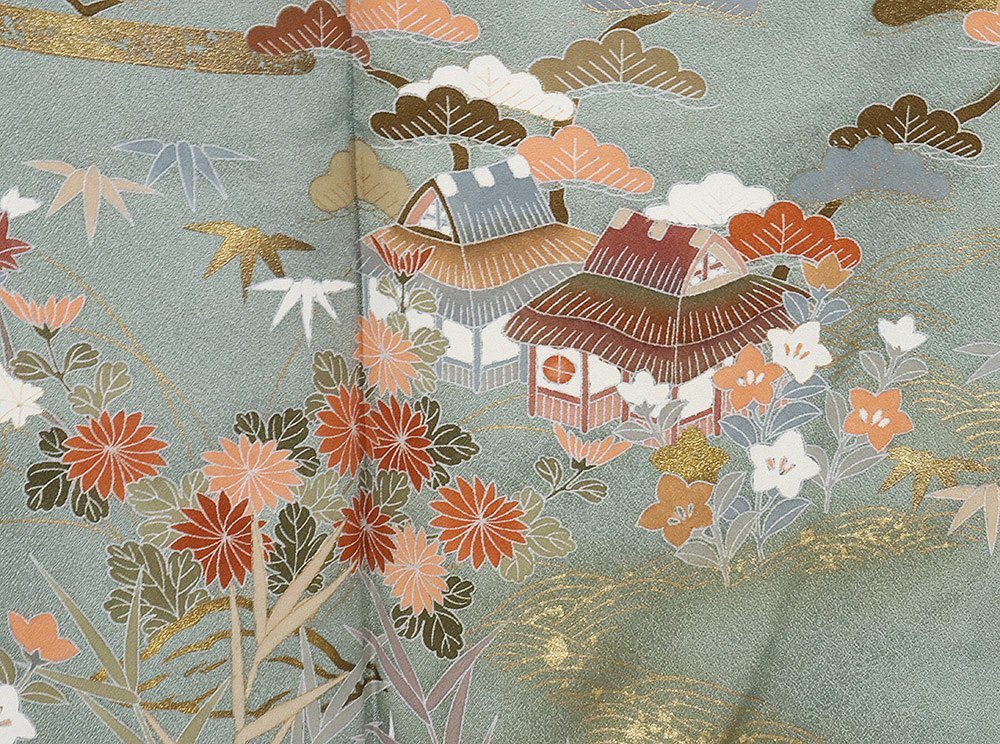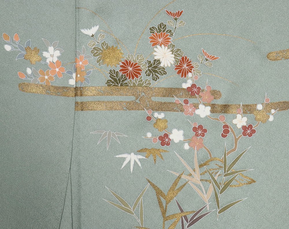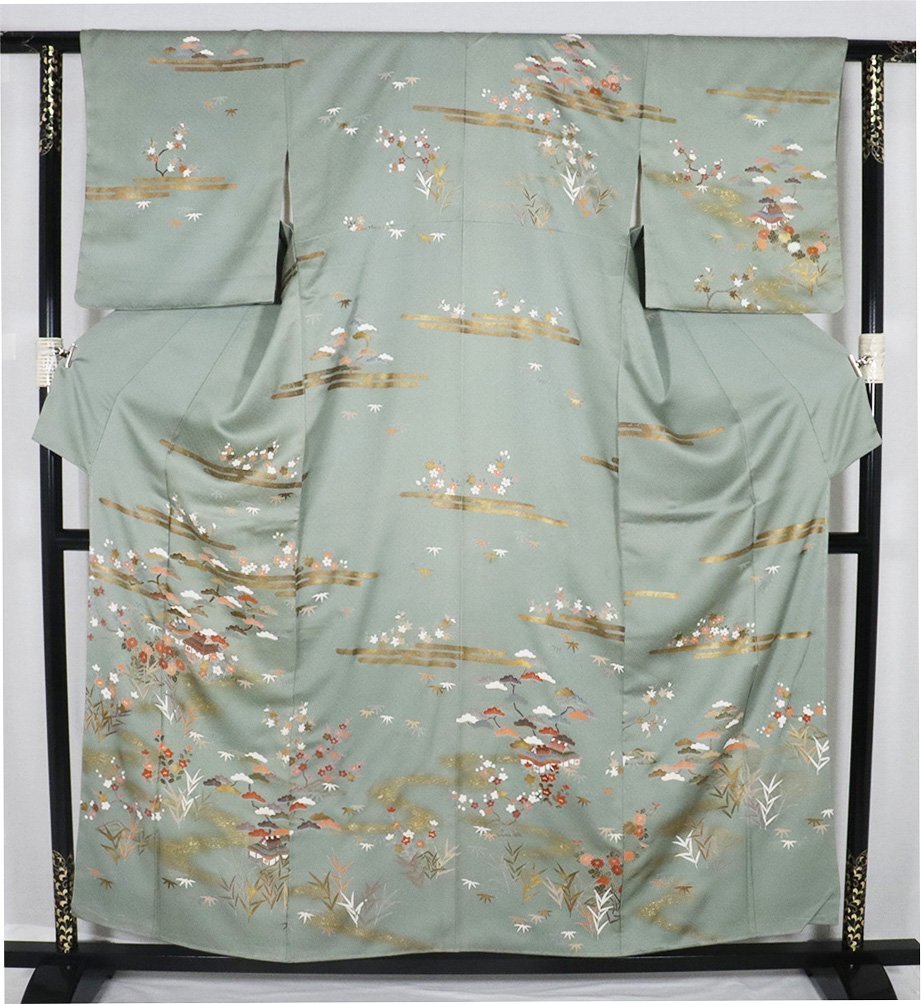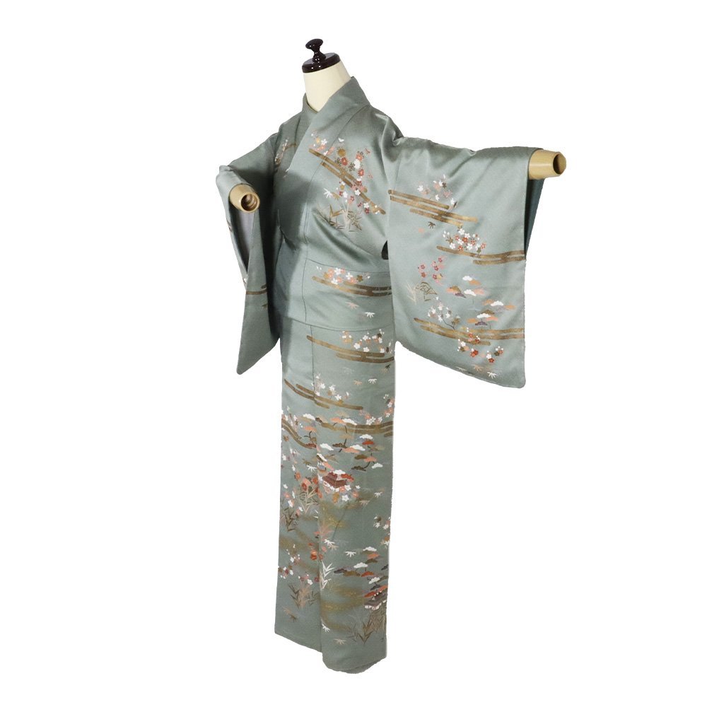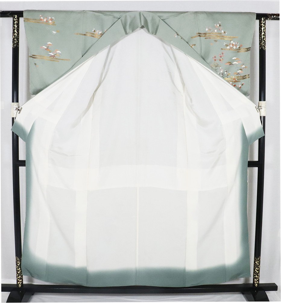 | 訪問着 袷 丹後縮緬地 緑・菱文地模様地 松竹梅・桜・菊・茶屋辻 金箔霞文 163 広襟 仕付け付き | |