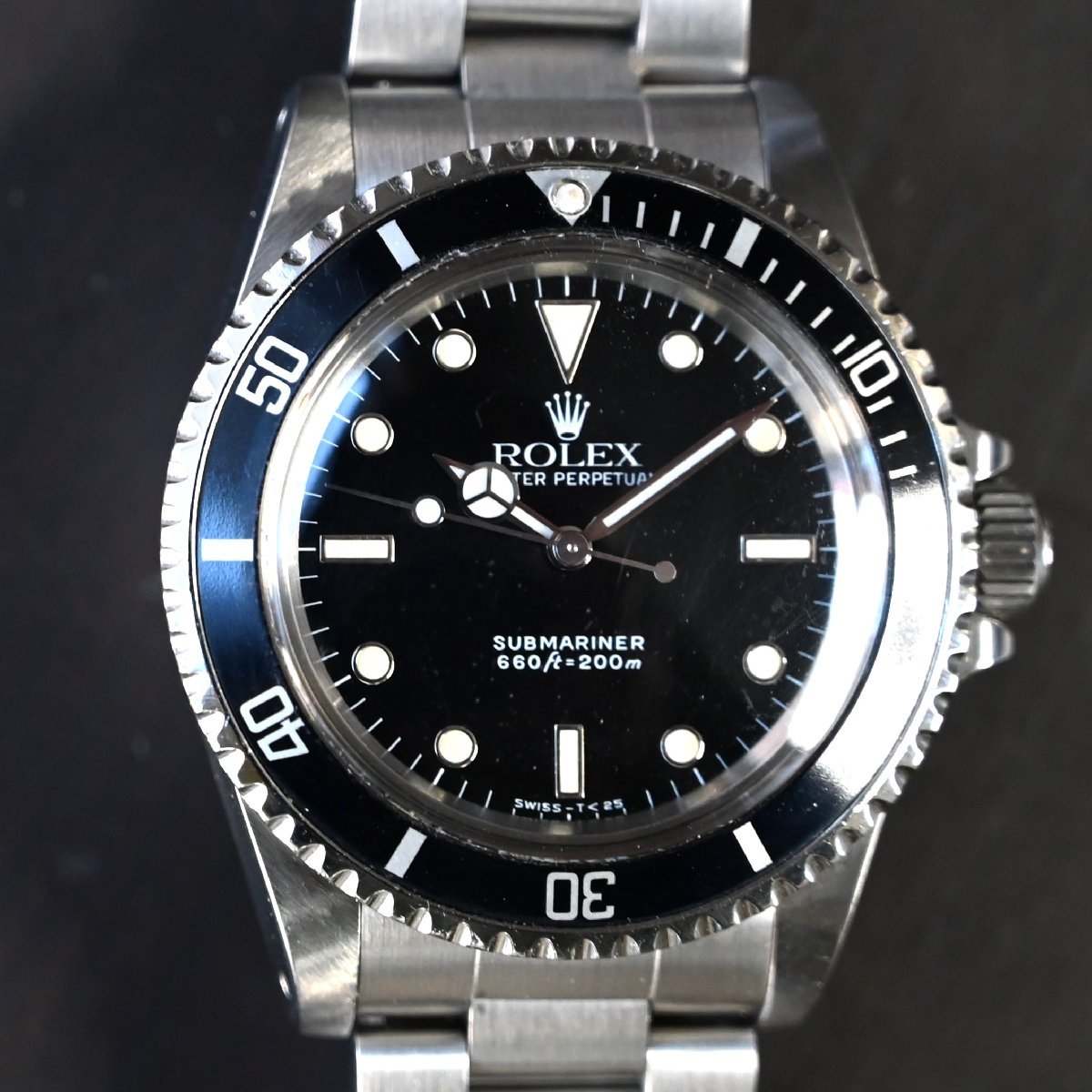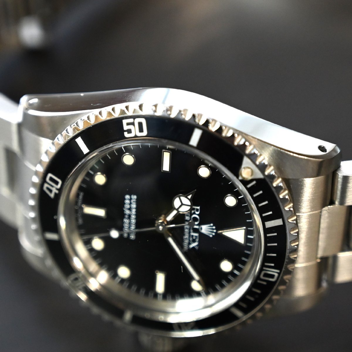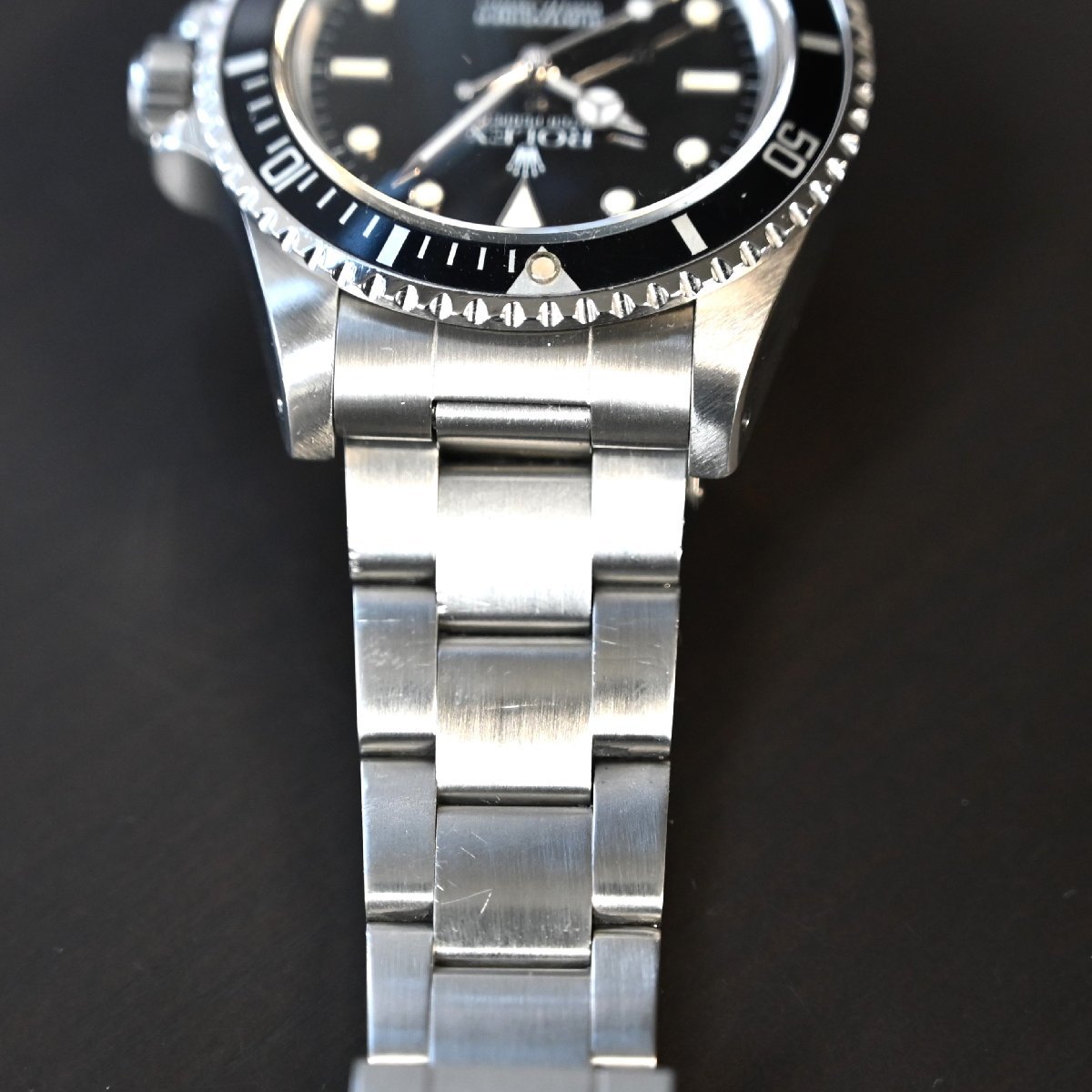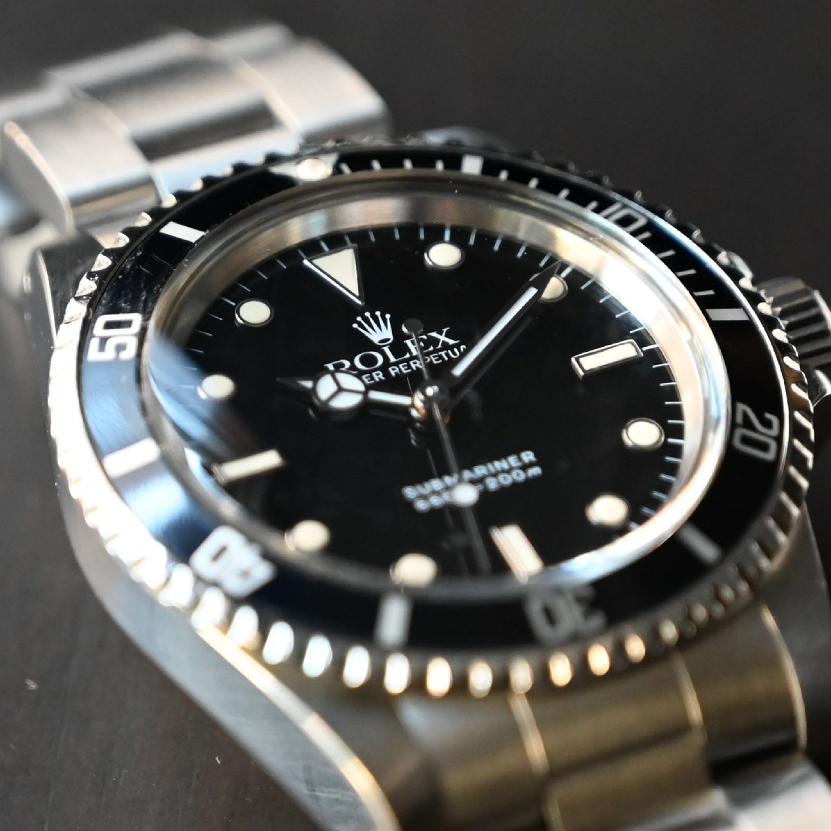 サブマリーナ5513のメーカーメンテナンスされた個体 ケースは画像のように痩せもなく綺麗 6時側のラグ部に傷 ブレスレットは6時側の方に傷が多少あります。2011年あたりの溝あり ブレスナンバー93150 フラッシュフィット580 クラスプコードCP 針はルミノバ交換されてます。 年代の割にケースコンデイションは非常にいいです。またメーカーメンテナス済 精度も平置き4秒程と良好