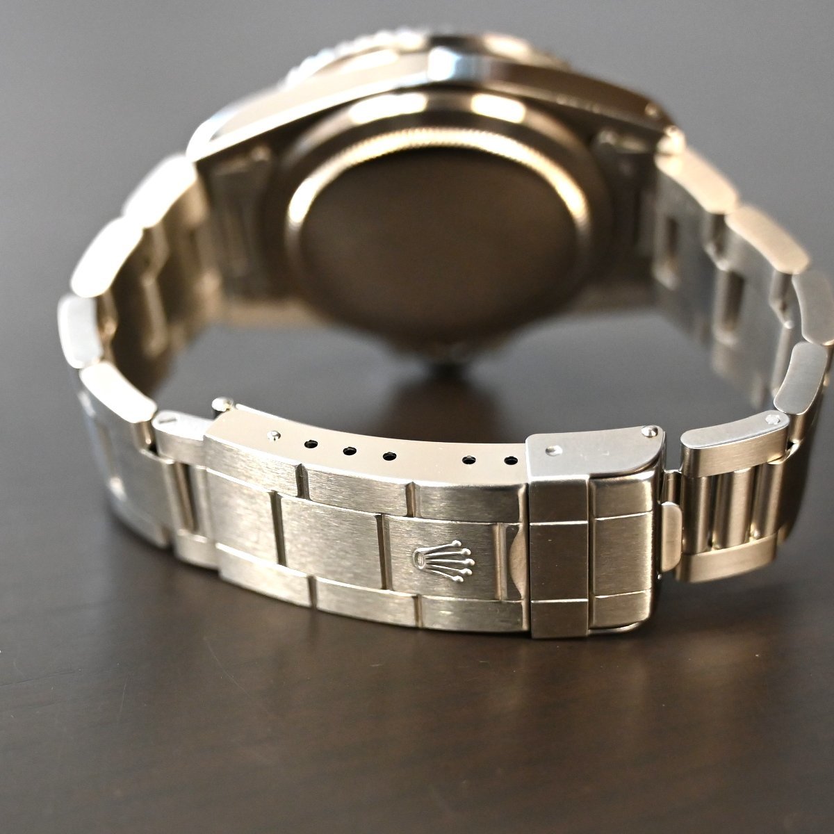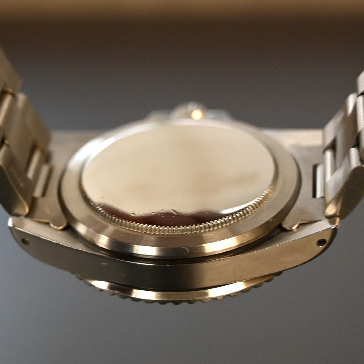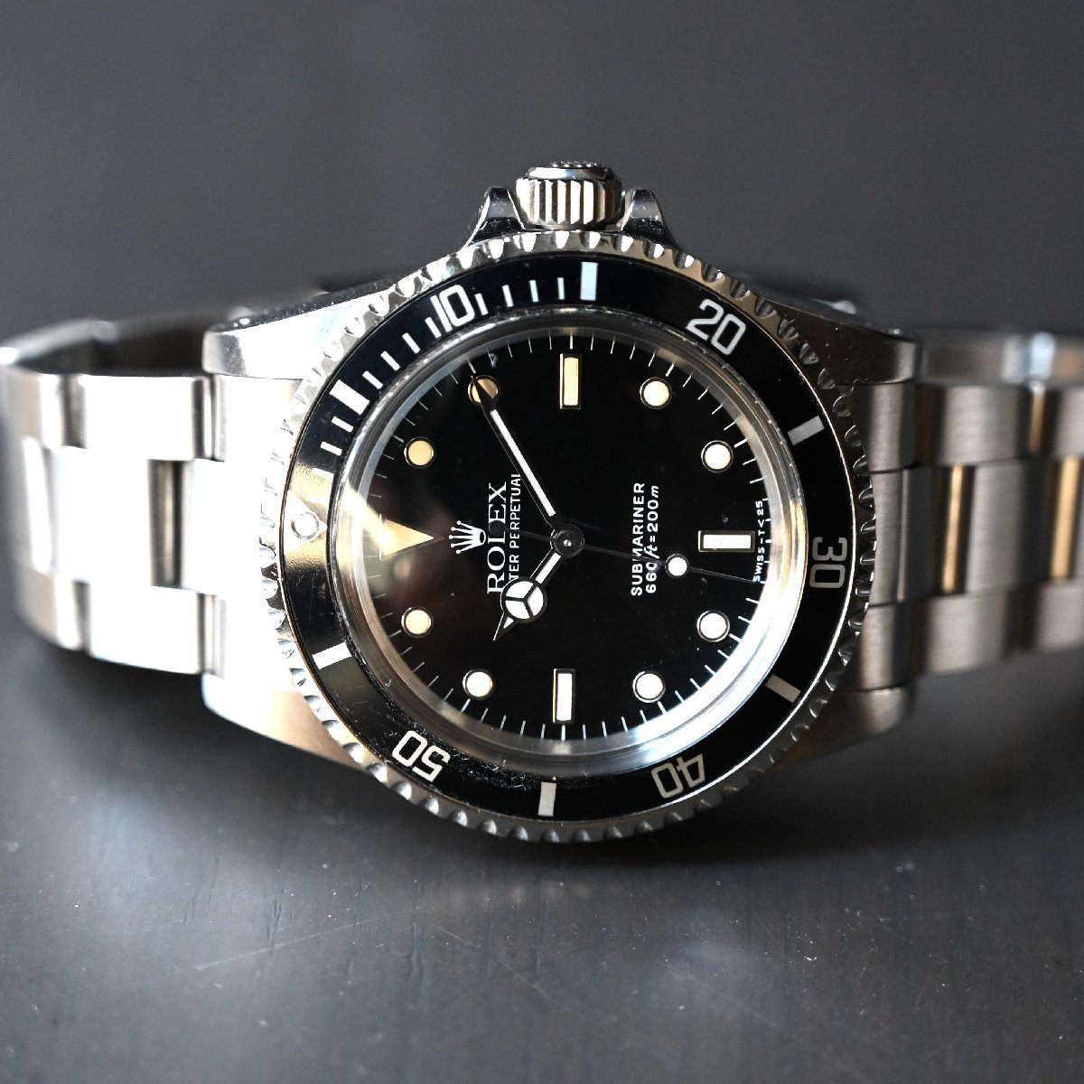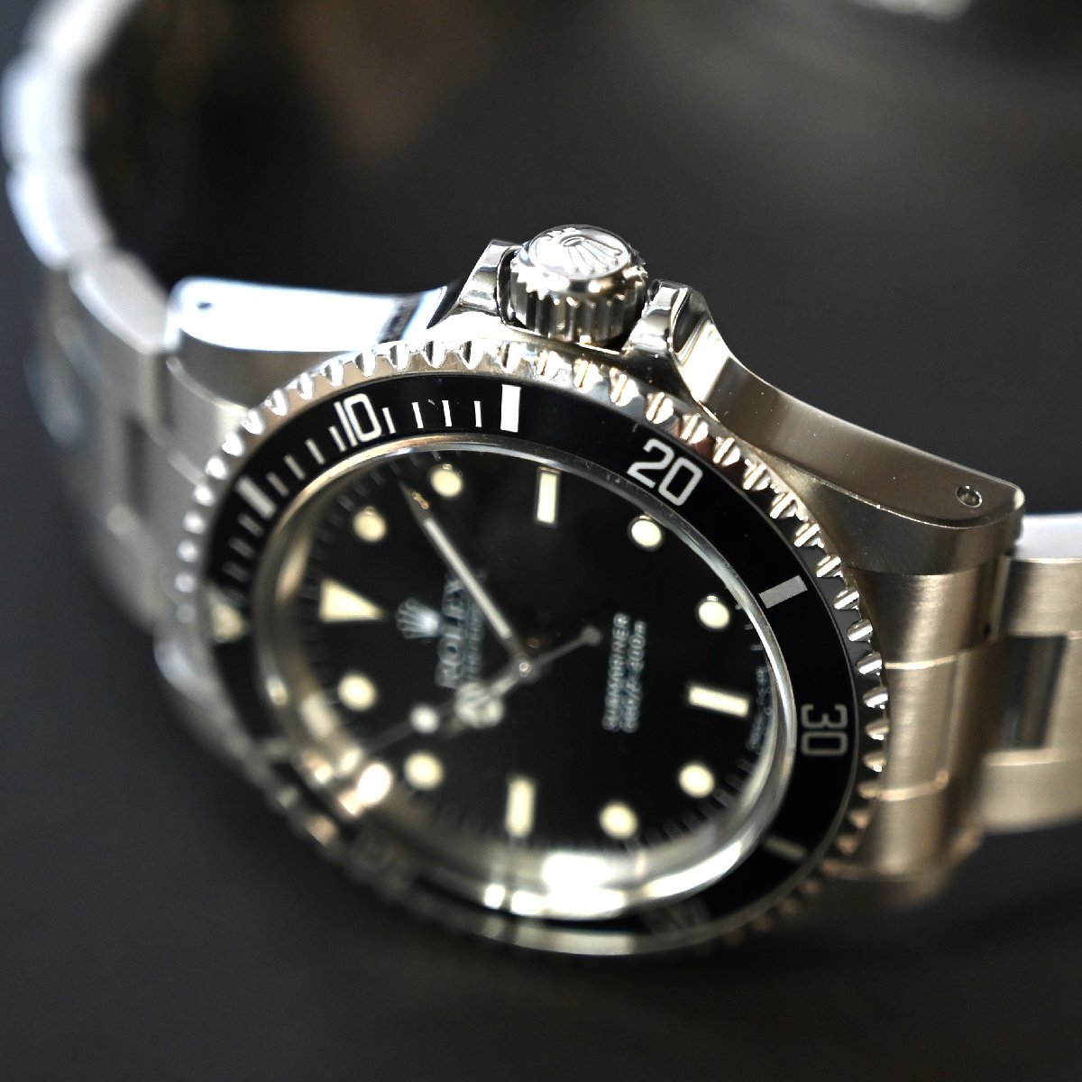 サブマリーナ5513のメーカーメンテナンスされた個体 ケースは画像のように痩せもなく綺麗 6時側のラグ部に傷 ブレスレットは6時側の方に傷が多少あります。2011年あたりの溝あり ブレスナンバー93150 フラッシュフィット580 クラスプコードCP 針はルミノバ交換されてます。 年代の割にケースコンデイションは非常にいいです。またメーカーメンテナス済 精度も平置き4秒程と良好