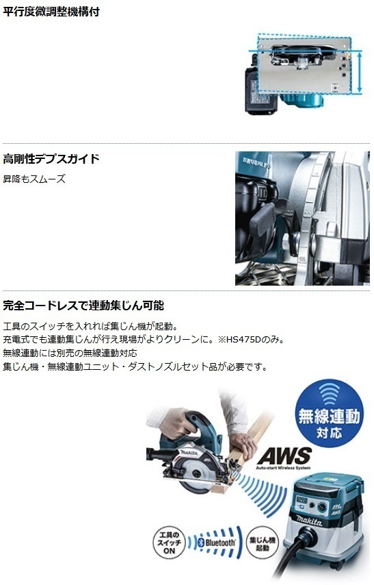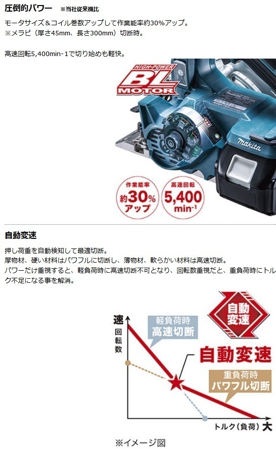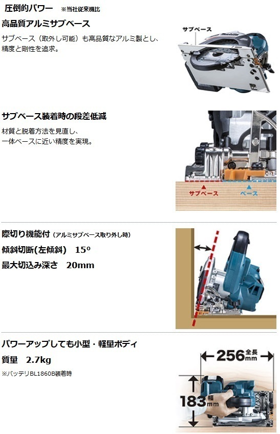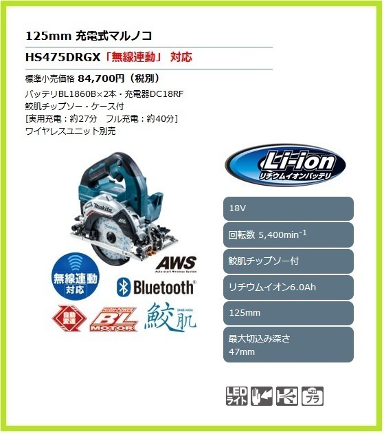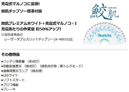| 標準付属品 | 鮫肌チップソー(A-67175)・六角棒レンチ(783203-8) バッテリ(BL1860B)×2本・充電器(DC18RF)・ケース |