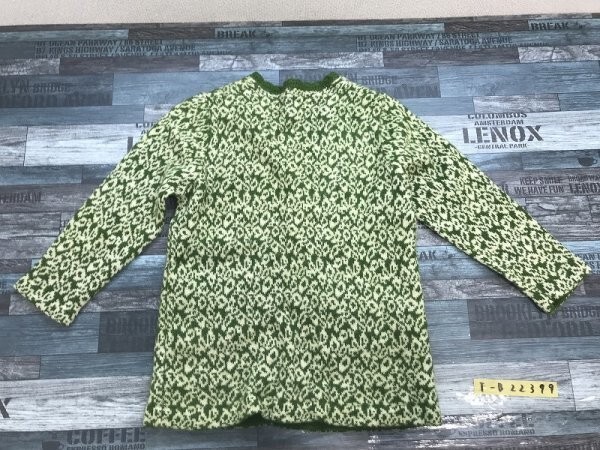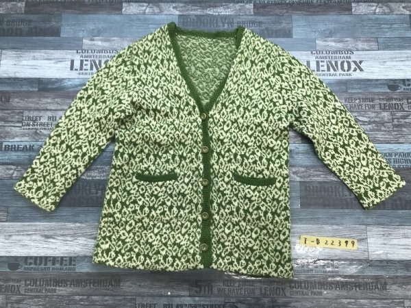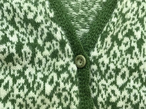 レディース 柄織り Vネック ニット カーディガン 緑アイボリー です。