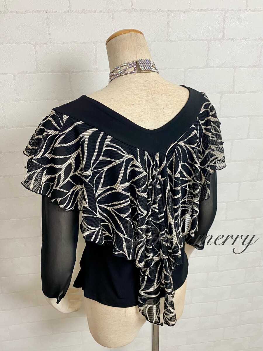 トップスは背中に流れる大きなフリルが華やかな逸品。