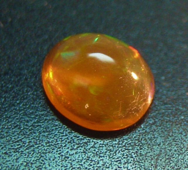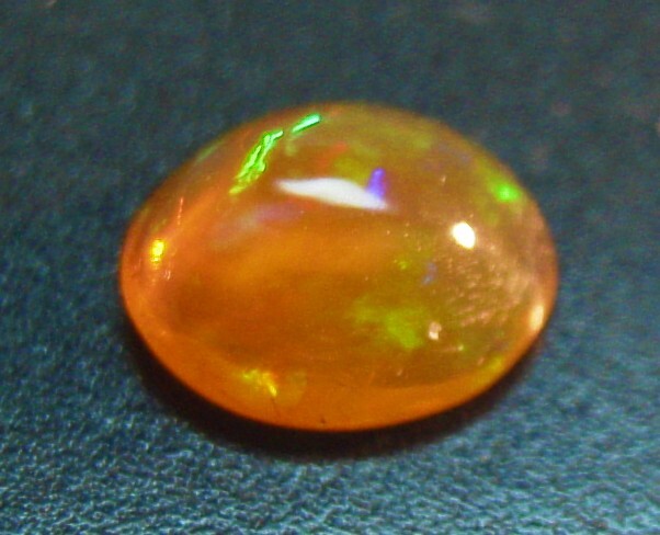 今回のファイアーオパール、プレイオブカラー(遊色効果・オパール特有の七色効果)も実に見事にきれいに見られるファイアーオパールの逸品です。一般的に濃いオレンジや赤のメキシコ産オパールはプレイオブカラーの余り無いものが多いのです。また通常オパールは赤いプレイオブカラーの出るものを価値高く見ますが、ファイアーオパールの場合は地色自体が赤系の色ですから、プレイオブカラーは逆に緑の色がたくさん見られる方が色のコントラストが鮮やかになります。つまり赤・オレンジの地色の中に緑のプレイオブカラーが踊る、と云う感じですね。今回のファイアーオパールはまさしくそう云う逸品なのです。