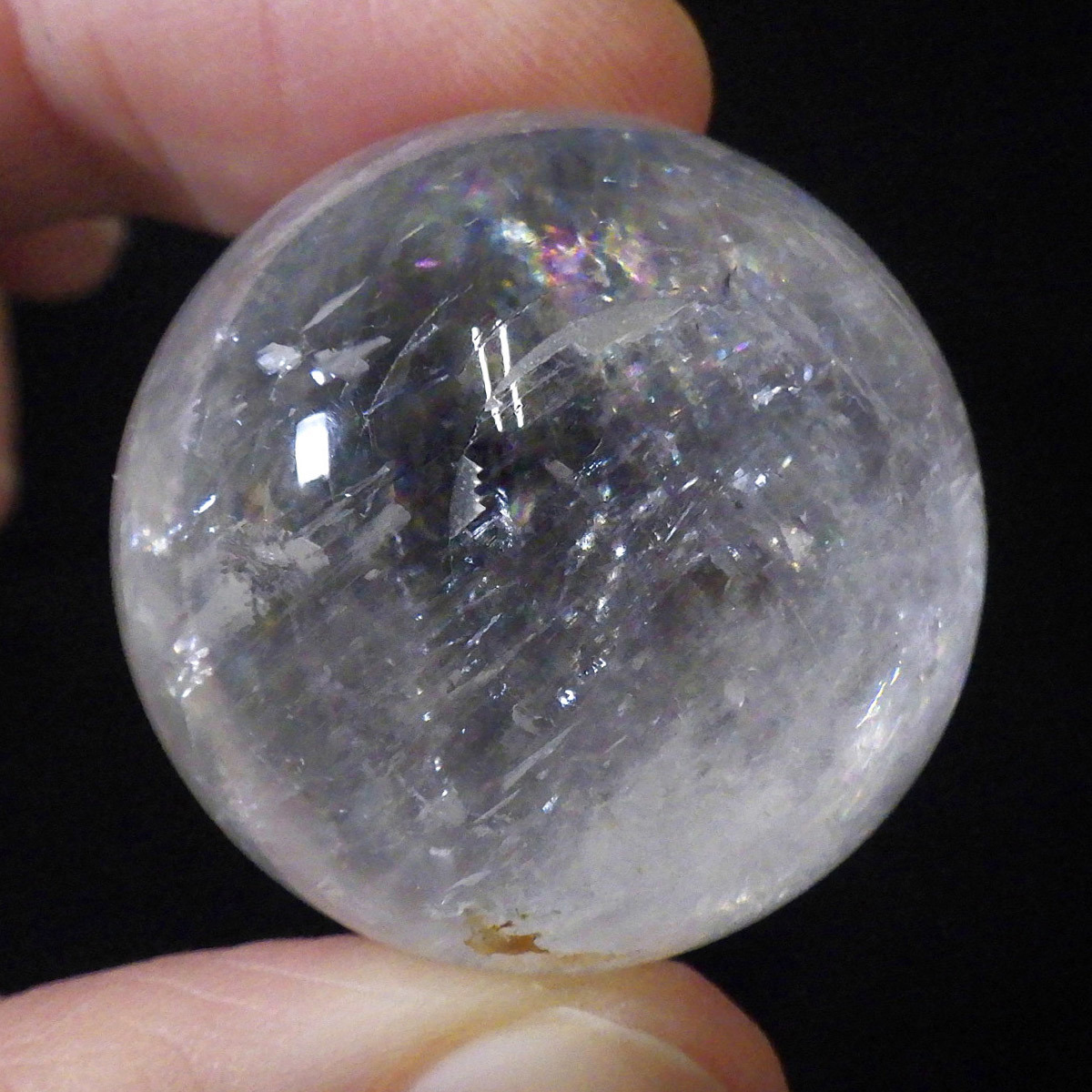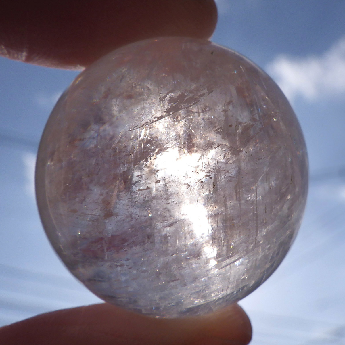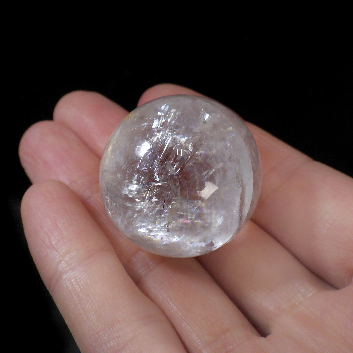 チャイナ産、レインボーカルサイトスフィアです。高い透明度を持ち、様々な角度からレインボーを見ることができます。複屈折という光学現象を持ち、文字の上に載せると二つにダブって見える「ダブリング(二重像現象)」のような現象を起こします。一定方向に向かって割れる劈開性によって平行四辺形の形になります。