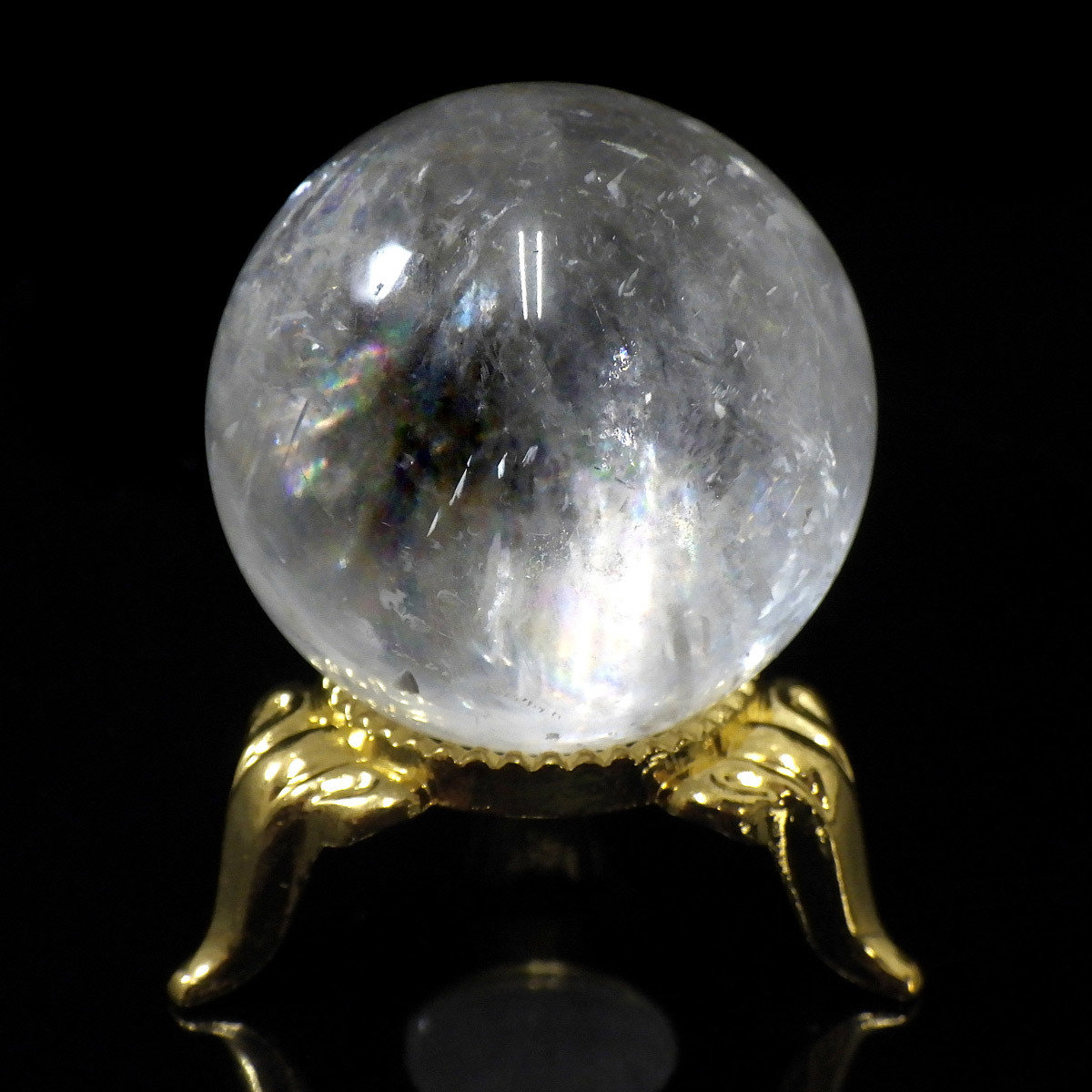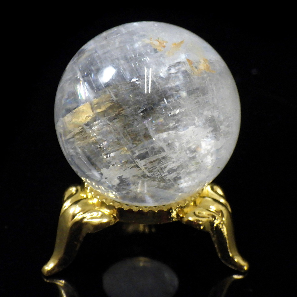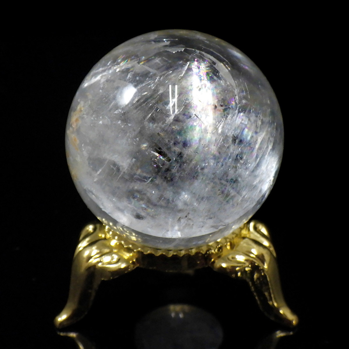 チャイナ産、レインボーカルサイトスフィアです。高い透明度を持ち、様々な角度からレインボーを見ることができます。複屈折という光学現象を持ち、文字の上に載せると二つにダブって見える「ダブリング(二重像現象)」のような現象を起こします。一定方向に向かって割れる劈開性によって平行四辺形の形になります。