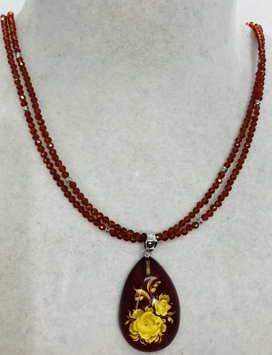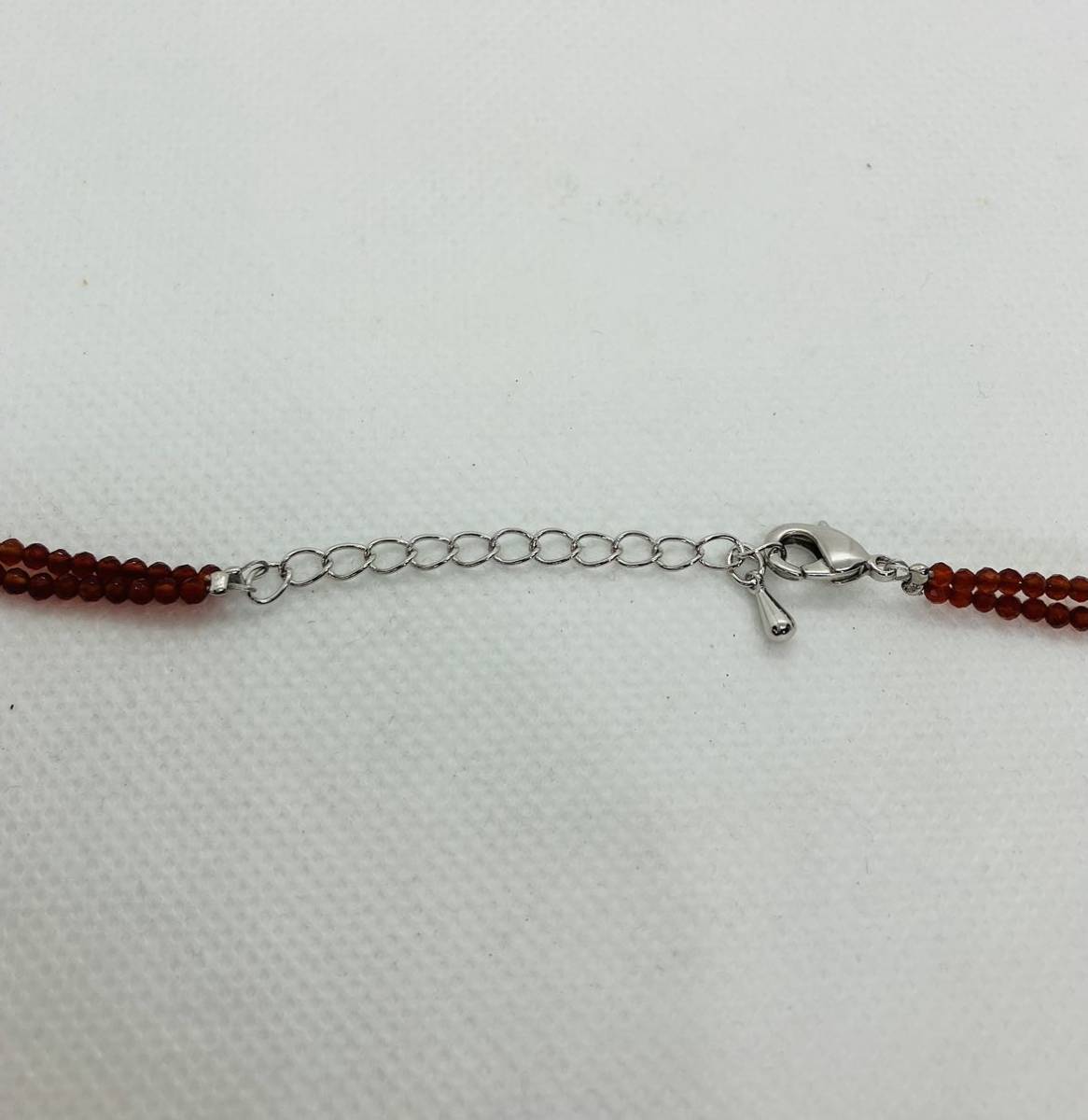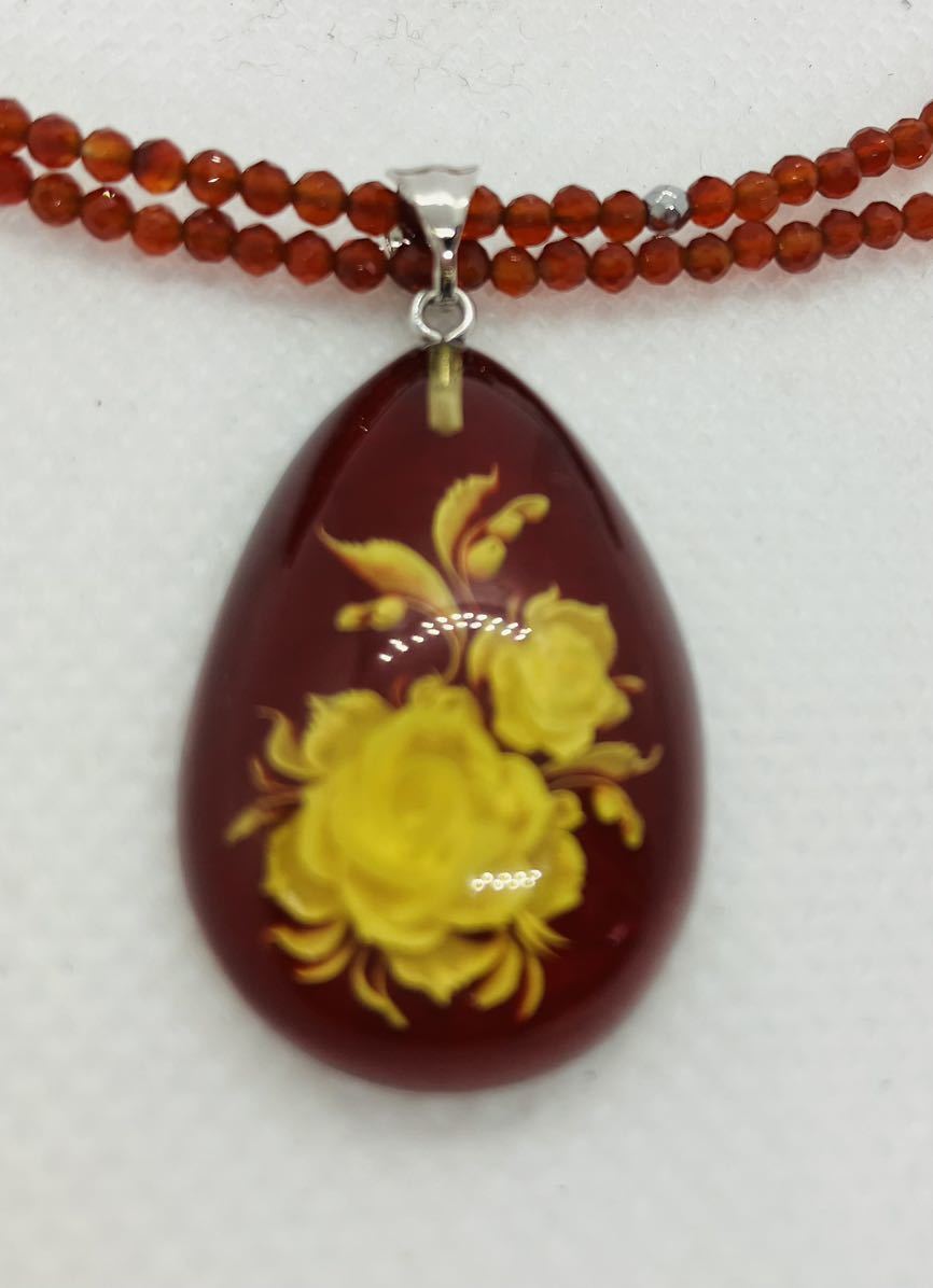 シルバー製金具に琥珀3センチ×2センチ、裏から削って表に薔薇の花を浮き出す、インタリオ方式のペンダントに、2ミリにミラーカットされた、赤メノーを2連に仕上げた全身50センチに5センチのアジャスター付きのネックレスのセットです。ネックレスからペンダントを外せますので、セットでも別々でもお使いいただけます。