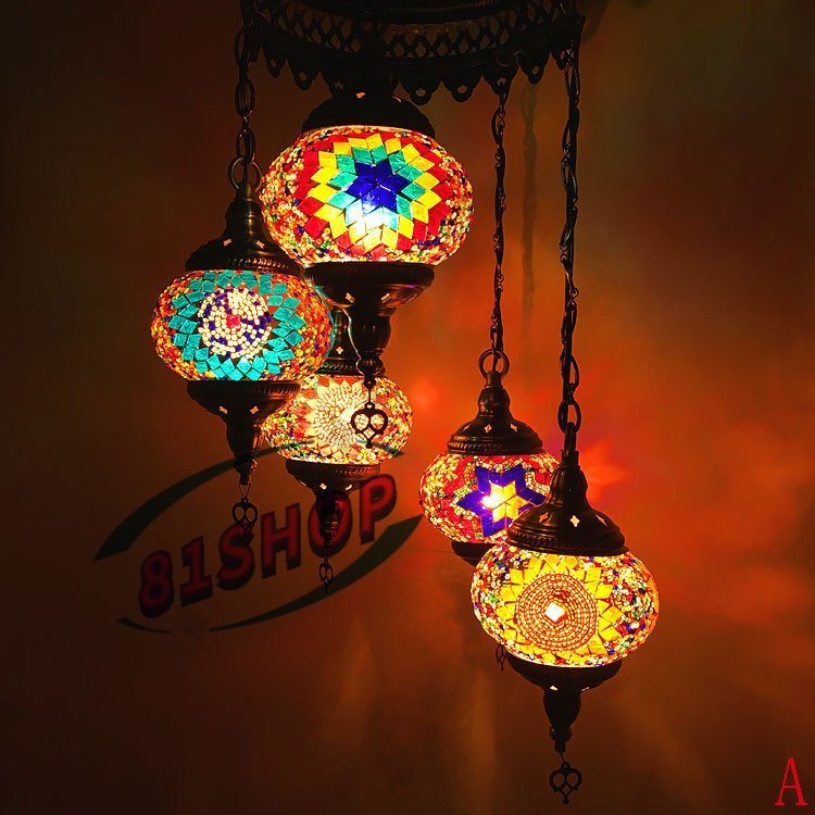 「81SHOP」トルコランプ職人手作りカラーガラス 吊り下げ照明リビング、寝室、レストラン、カフェー、ホテル、民宿、バー飾り5灯式 A