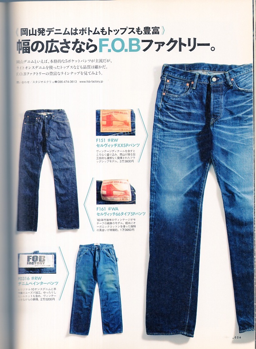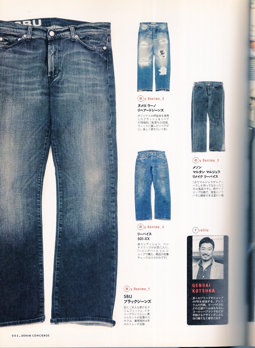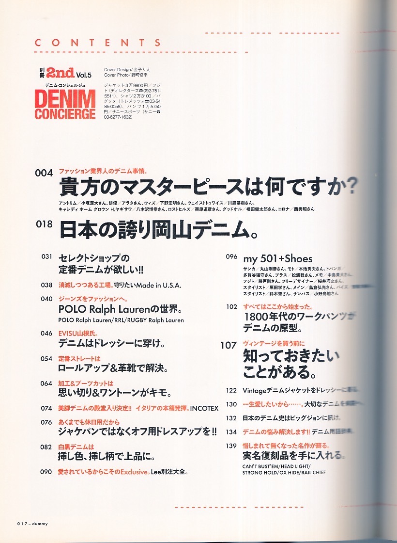 【contents】 デニムのことなら武骨系からドレッシーまでヴィンテージから伊ブランドまでお任せあれ! ●ファッション業界人のデニム事情。 あなたのマスターピースは何ですか? ●日本の誇り岡山デニム ●セレクトショップの定番デニムが欲しい!! ●ジーンズをファッションへ POLO Ralph Lauren の世界 ●EVIS山根氏。デニムはドレッシーに穿け。 ●ジャケパンではなくオフ用ドレスアップを!! ●ヴィンテージを買う前に知っておきたいことがある。 | ||