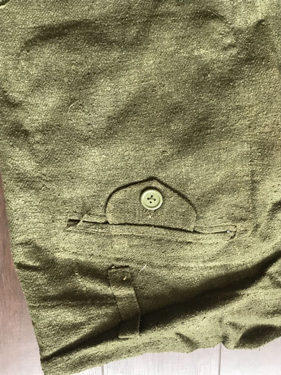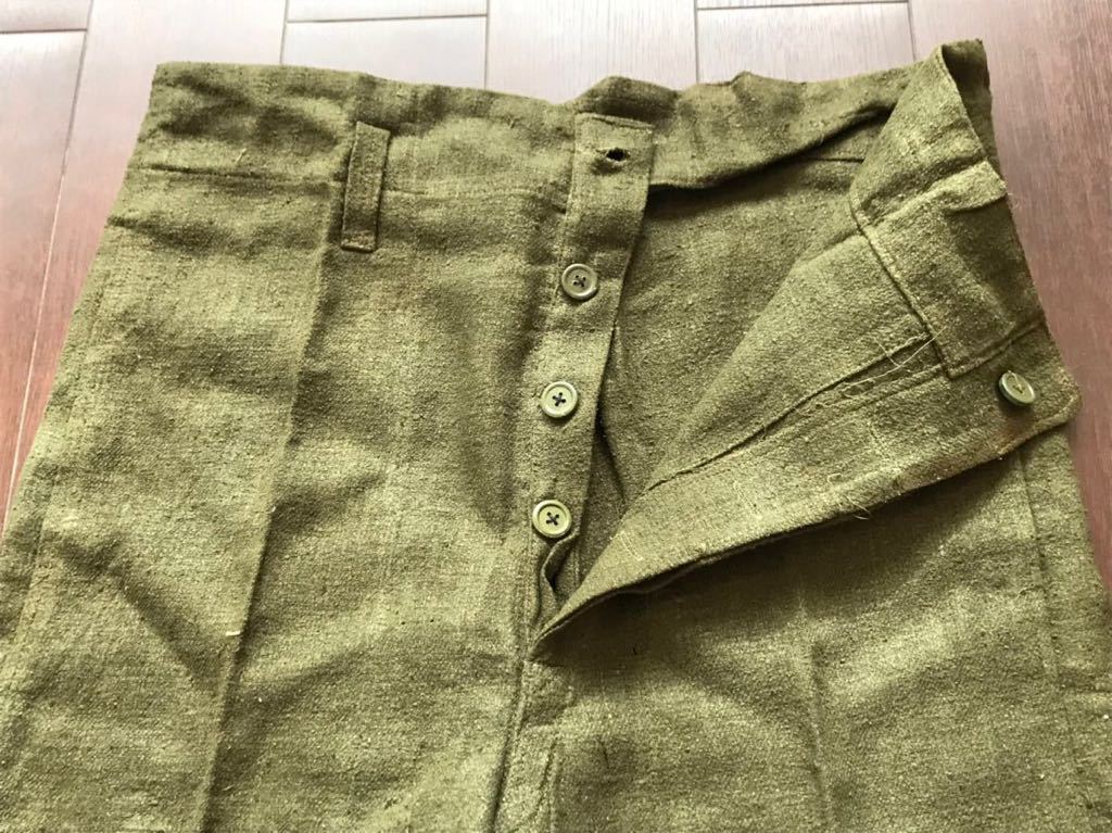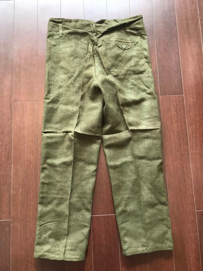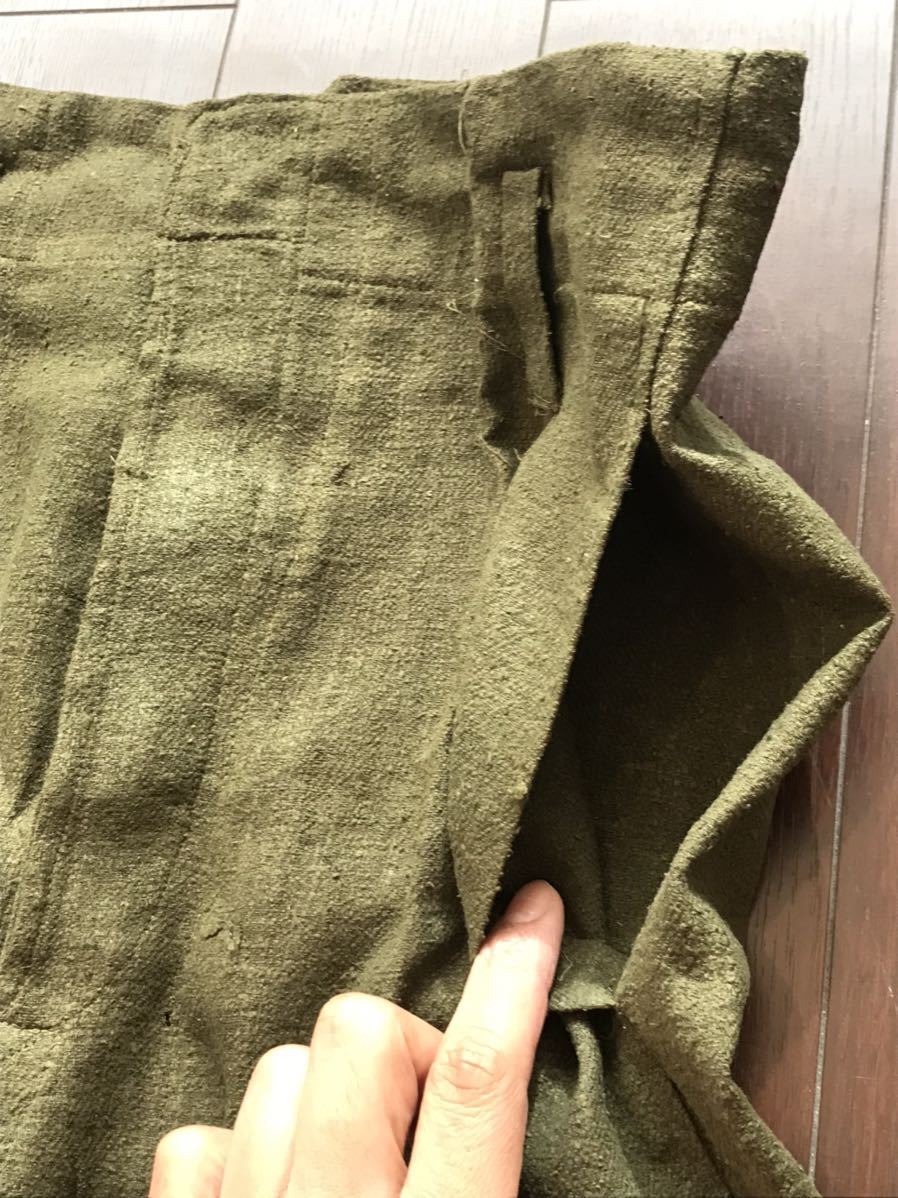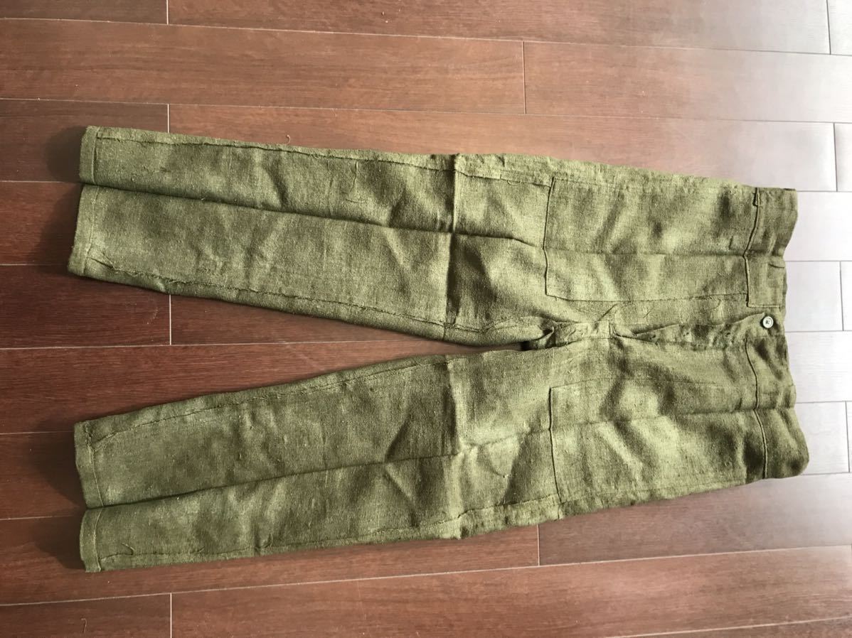 おそらく1940年代頃かそれ以前の日本のもので、旧日本軍のものかもしれませんが定かではありません、もしくはそちら関係の制服だったのかもしれません。シルエットも良く起毛したような粗めの質感の生地の雰囲気が素晴らしいです。ビンテージのチノパンやなどのワークパワークパンツが好きな方に非常にオススメです。欲しい方は是非!