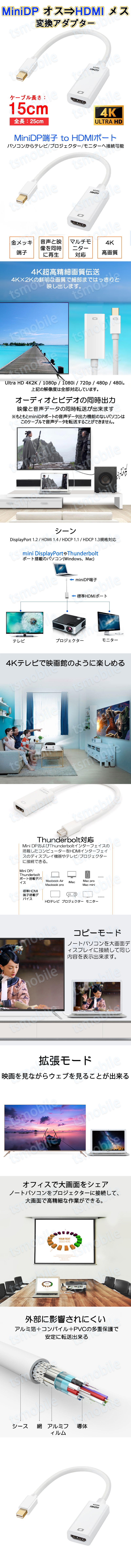 | パソコンからテレビ/プロジェクター/モニターへ接続可能金メッキ端子で錆びにくく、長持ち。Ultra HD 4K2K / 1080p / 1080i / 720p / 480p / 480i解像度対応4K×2Kの鮮明な画質で細部まではっきりと映し出します。DisplayPort 1.2 / HDMI 1.4 / HDCP 1.1 / HDCP 1.3規格対応。オーディオとビデオの同時出力映像と音声データの同時転送が出来ます。オフィスで大画面をシェアThunderbolt対応Mini DisplayportまたはThunderboltインターフェイスの搭載したコンピューターをHDMIインターフェイスのディスプレイ機器やテレビ/プロジェクターに接続できる。コピーモードノートパソコンを大画面ディスプレイに接続して同じ内容を表示出来ます。拡張モードマルチモニター対応,マルチ画面で同時に異なる内容を見ることができて、PCワークの効率アップに役に立つ。外部に影響されにくいパラメータ名称:Mini DPオス to HDMIメスケーブル解像度:4K*2Kインターフェース:ミニDP端子、HDMIポート全体長さ:25cm注:必要なインターフェースに合わせて購入してください(疑問がある場合は、カスタマーサービスにお問い合わせください) |