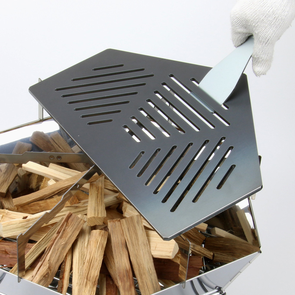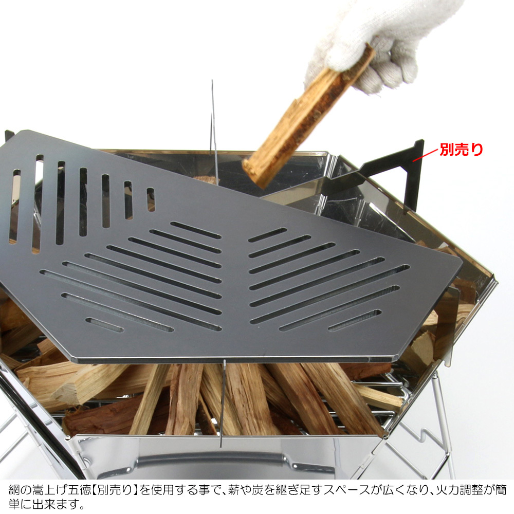 別売りの嵩上げ五徳を装着して頂くことで、網の嵩上げができ、料理中も薪の継ぎ足し、補充がスムーズに行えます。