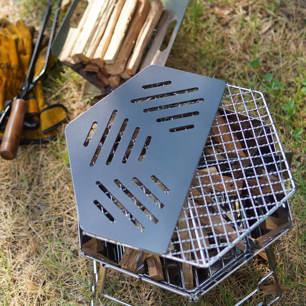 折りたたみ式焚き火台の六角形に合わせた専用設計で、鉄板がズレ落ちることなく安定してお使い頂けます。
