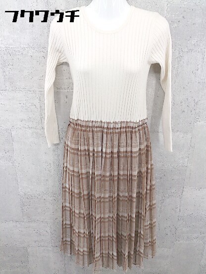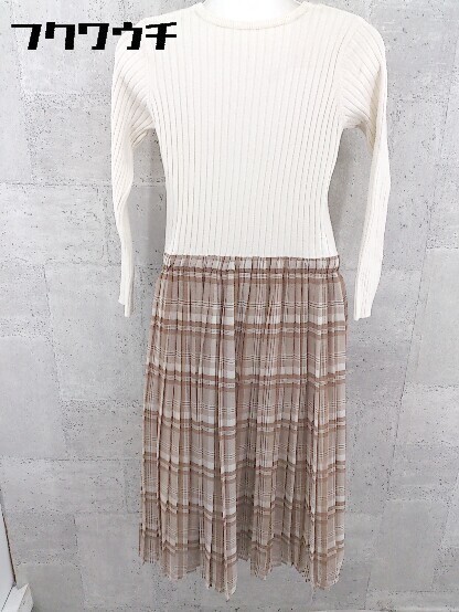 ◇ ROPE PICNIC ウエストゴム チェック 切替 長袖 膝下丈 ワンピース サイズ38 アイボリー ブラウン レディース
