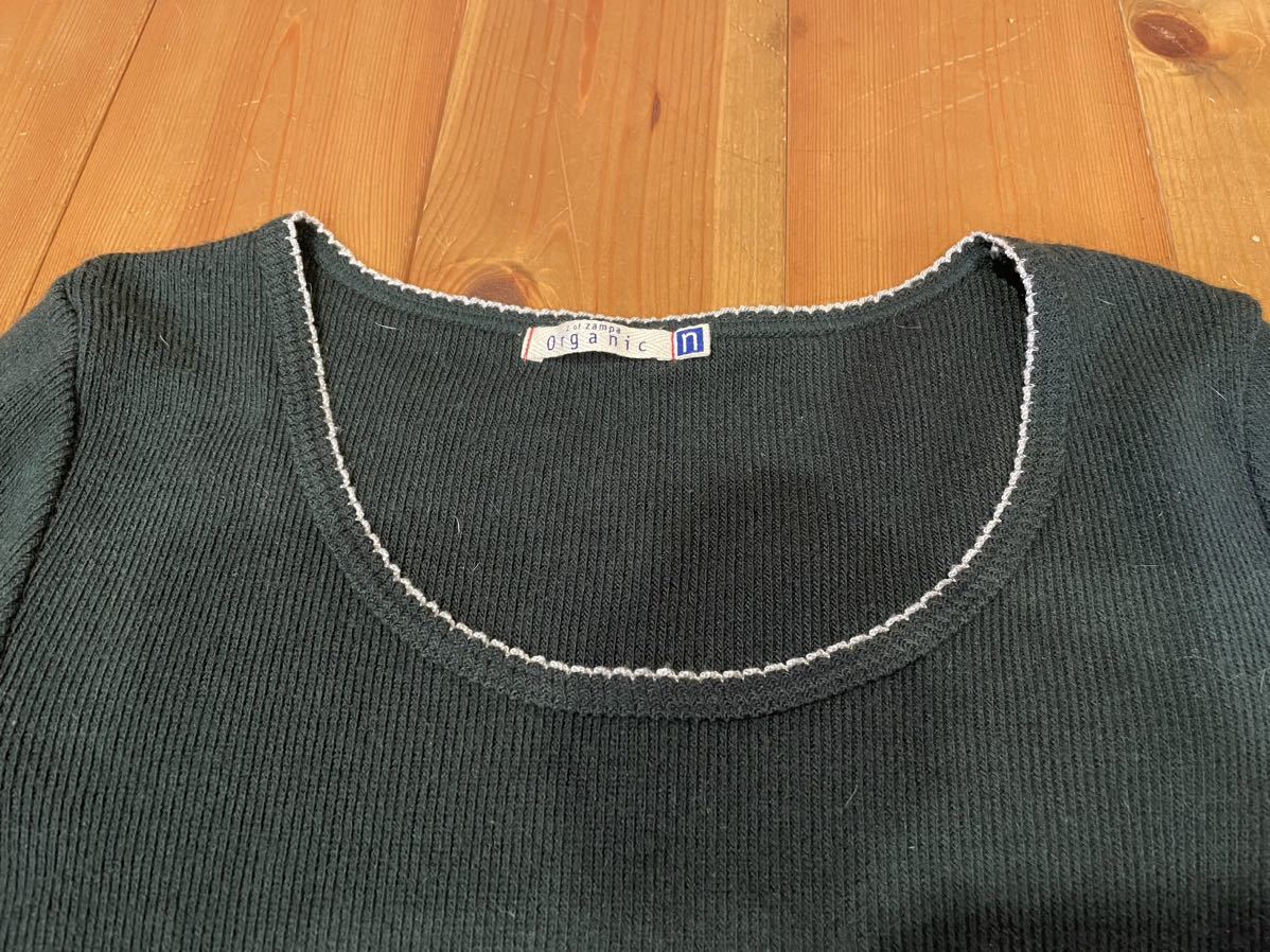 大きめに襟ぐりが開いているので、中にシャツなどを合わせると素敵です。