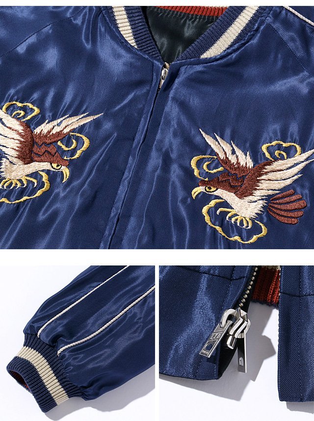 探求心と情熱を持って、上質なアイテムを製作し続けている「テーラー東洋」から、Early 1950s Style アセテートリバーシブルスカジャン「DRAGON HEAD×ROARING TIGER」(TT15491-128)のご紹介です。 2024年の干支である龍に因み、数あるヴィンテージスカジャンの中から選り抜いた龍の刺繍を復刻する辰年コレクションが登場しました! 表面は龍の頭部のみを細部まで描写した通称「ドラゴンヘッド」と呼ばれる絵柄。 近年新たに発見した1950年代前期の作品をもとにしており、テーラー東洋での復刻も初となります。 淡いグリーンの龍の顔や朱色がかった炎などは、当時の日本ならではの刺繍糸の色味。 身頃も袖下も紺で統一されたネイビー単色のボディ、白1色のロープパイピング(通常は2色で撚っているもの)など、ヴィンテージを細部まで再現しました。 リバーシブル面は竹林の中で猛々しく吼える虎の絵柄。 「竹と虎」は古来から取り合わせが良いとされスカジャンのモチーフとしても度々描かれてきたが、本作のように竹がクロスした構図は他に類を見ません。 ブラックのボディに映える赤い笹の葉が印象的だが、虎の刺繍をよく見ると前足の輪郭や黒い縞模様にも部分的に赤い色糸を使い、迫力を強調していることがわかります。 スーベニアジャケットのなかで最もスタンダードな両面にアセテート生地を使ったリバーシブルタイプ。 戦後当時のスカジャンには、シルクに似た高級感を持つ物資統制外品目のアセテートが使われていました。 中綿がないため季節を問わず着用でき、独特なドレープ感も魅力といえます。 1枚持っているだけでずっと使えるアイテムです。  | ||||||||||||||||||||