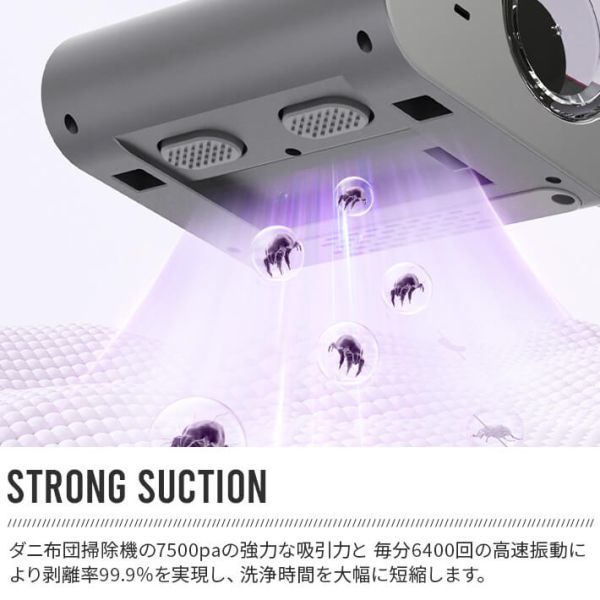 当社のダニ用布団掃除機は、7500paの強力な吸引力と毎分6400回の高速振動により、剥離率99.9%を実現し、洗浄時間を大幅に短縮します。