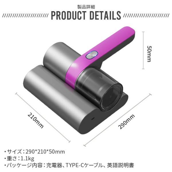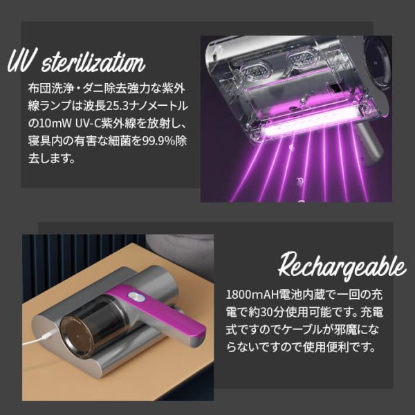 強力な紫外線ランプは、波長253ナノメートルの10mW UV-C紫外線を放射し、寝具内の有害な細菌を99.9%除去します。使用中、対象物から離れるか30度の角度になると、UVライトが自動的にオフになり、紫外線暴露のリスクを軽減します。超音波はダニのコロニーを破壊し、安全に除去します。