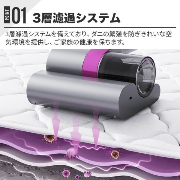 布団クリーナーは3層濾過システムを備えており、ダニの繁殖を防ぎ、きれいな空気環境を提供し、ご家族の健康を保ちます。温風乾燥機能で布団を乾燥させ、ふっくら快適な布団に仕上げます。