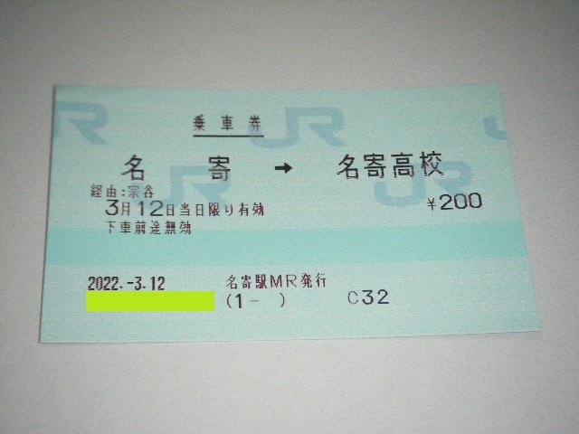 | 【JR北海道】名寄駅発行 2022.3.12 名寄→名寄高校 片道乗車券マルス券1枚【新品未使用】 | |