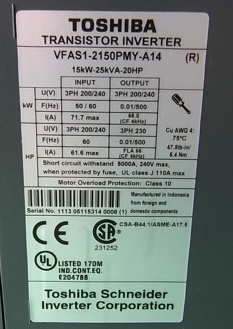 ま東芝製インバータ VFAS1-2150PMY-A14 15KW 三相200V 機械装置・回転数制御・省エネ・ お奨め品
