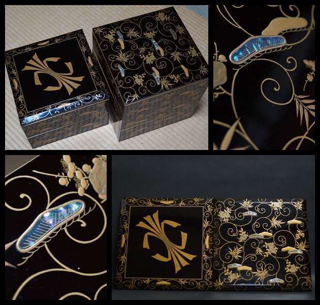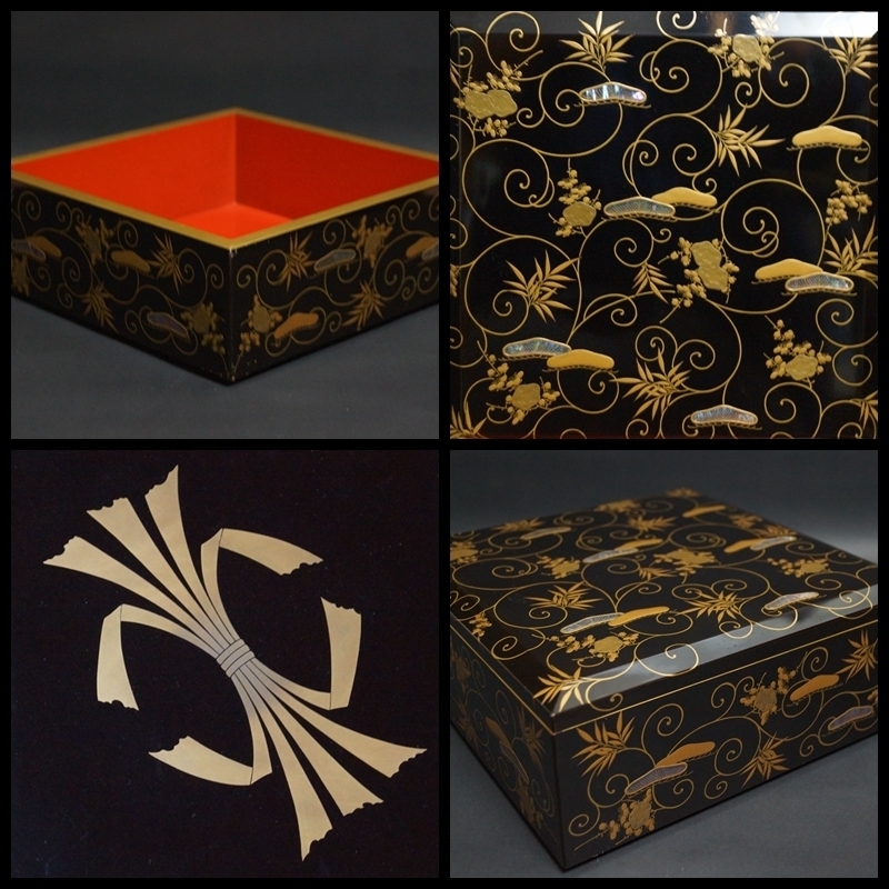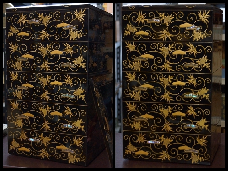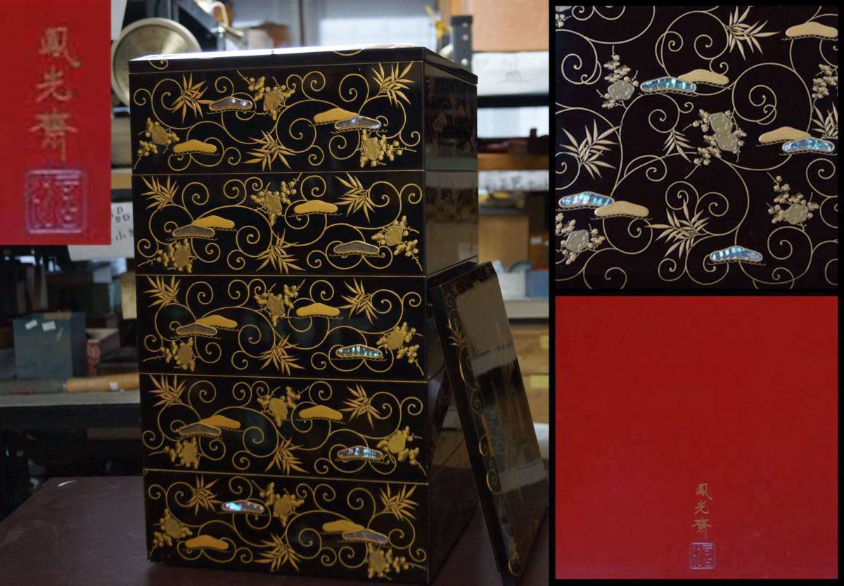明治五年 輪島塗 鳳光斎造色内朱金蒔絵青貝螺鈿象嵌『松竹梅文』木製五重箱 替え蓋共箱★時代物★希少品★ サイズ(約): 高さ42.5㎝、幅24.5㎝、重さ3.9㎏ |