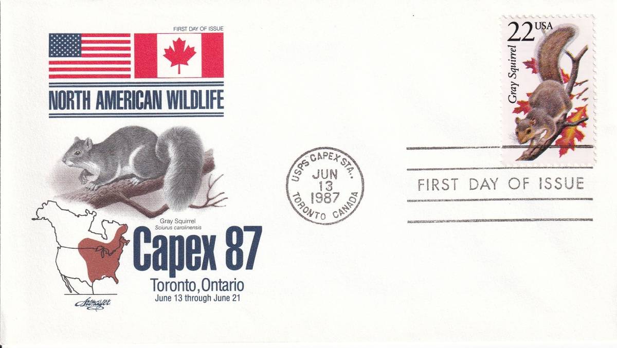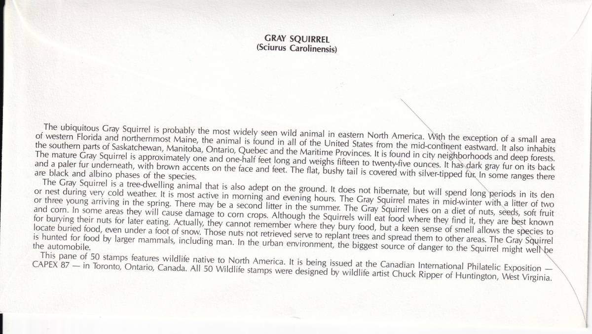 【FDC】アメリカの野生生物:灰色リス(15)(1987年)(アメリカ) t3950