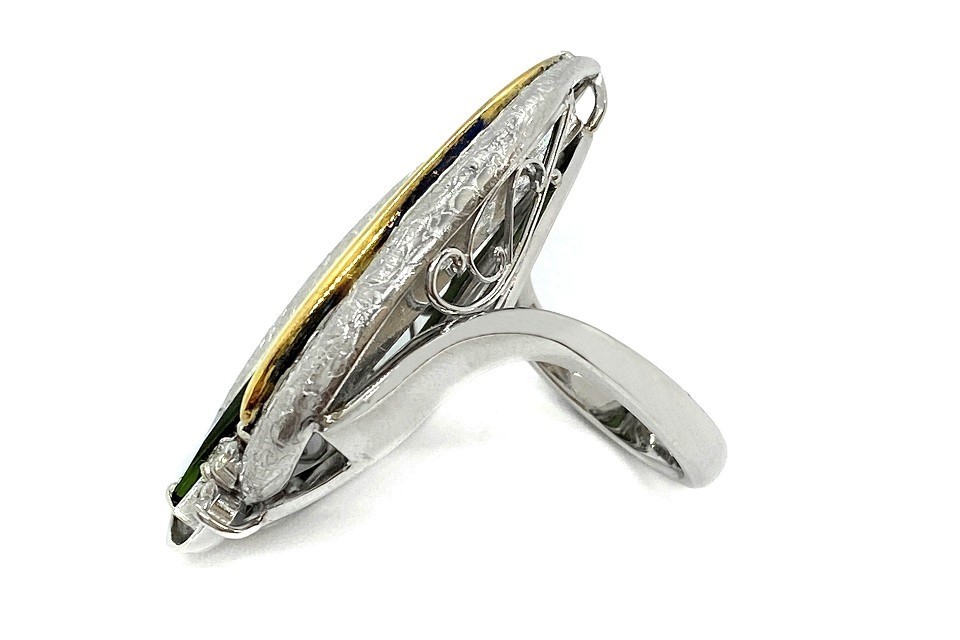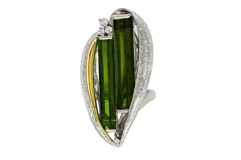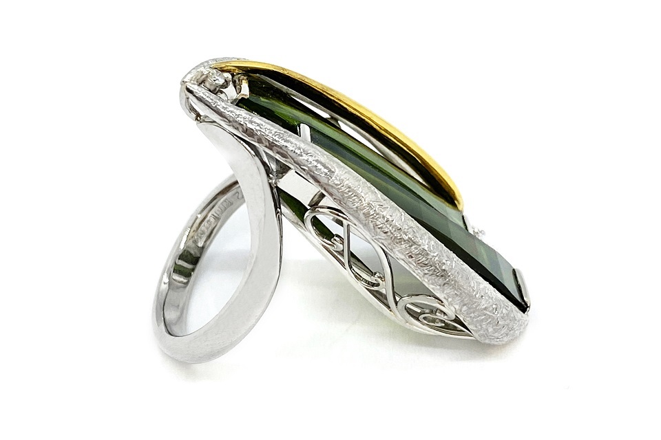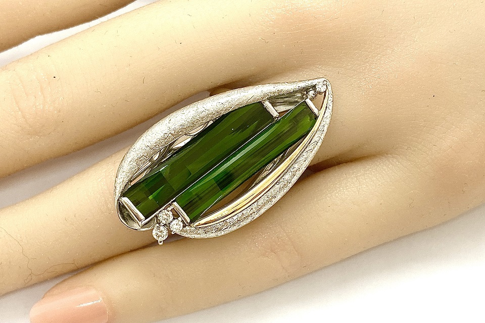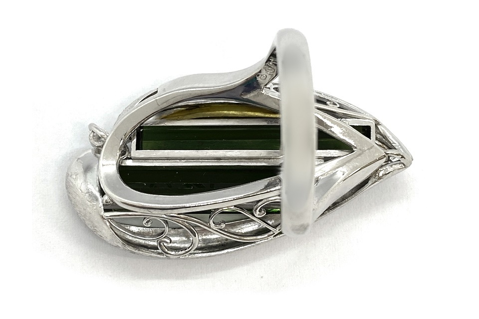 解説 | 近未来的な輝きを放つ、レクタンギュラーカットのトルマリン2石を用いた、ユニークな意匠。一見シンプルですが、見れば見る程凝った作りに感嘆! 重厚な推定作家作品です。 |