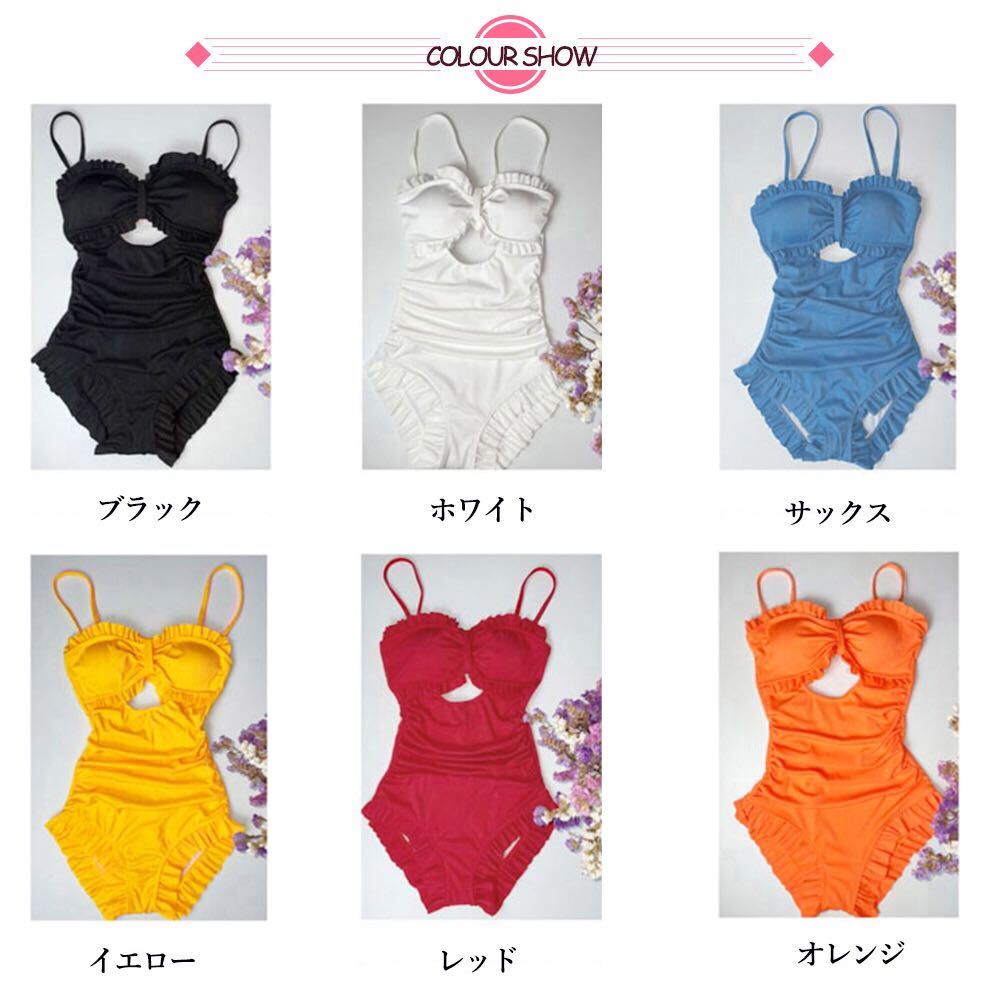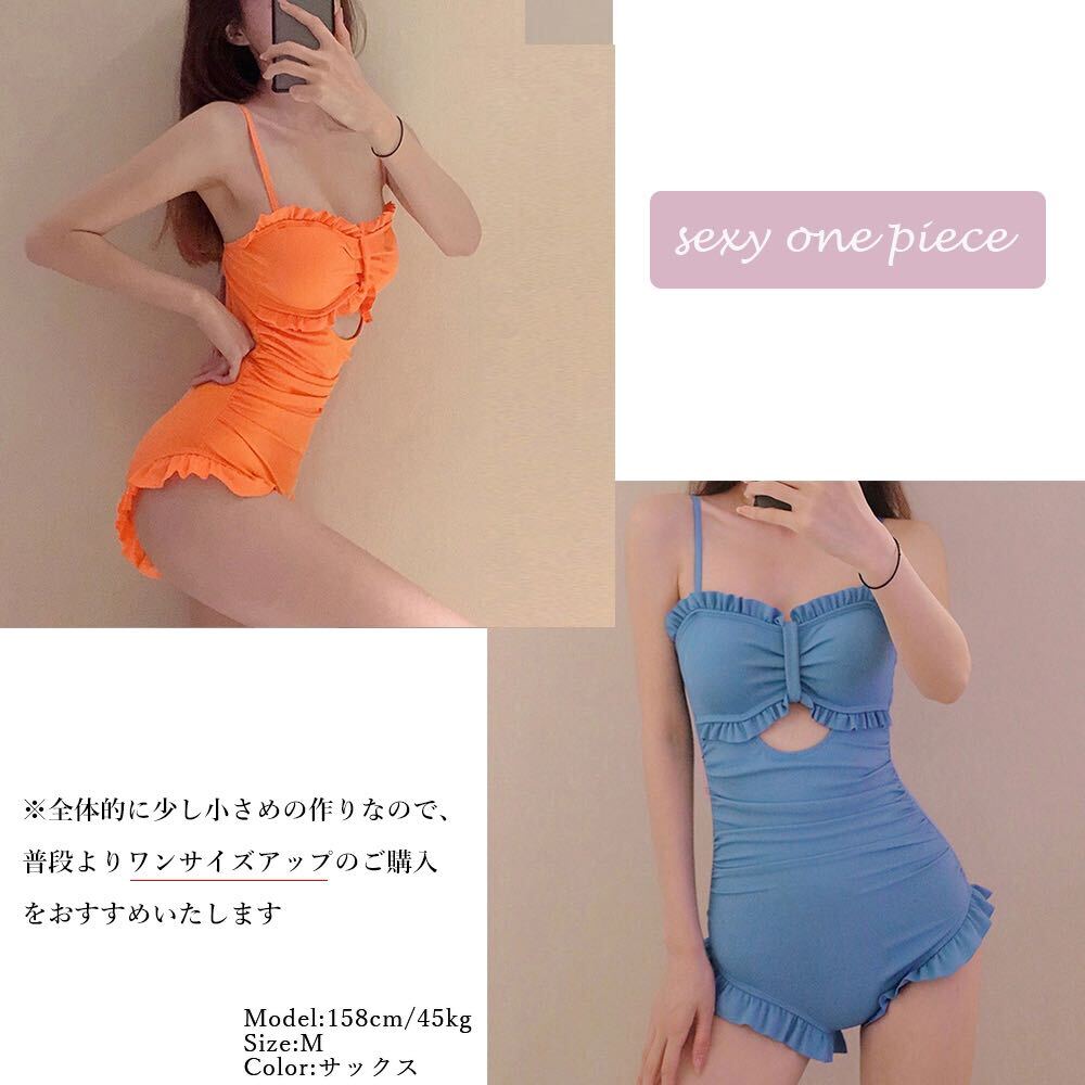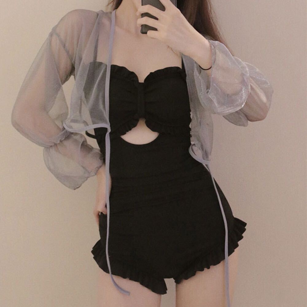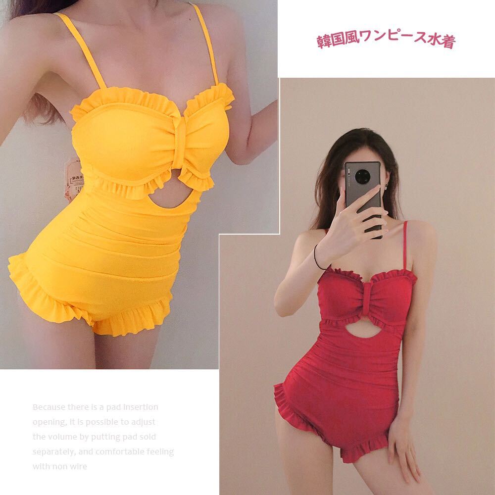 大人かわいいの体型カバー、お洒落に肌チラ見せフリル仕様韓国風ワンピース水着です