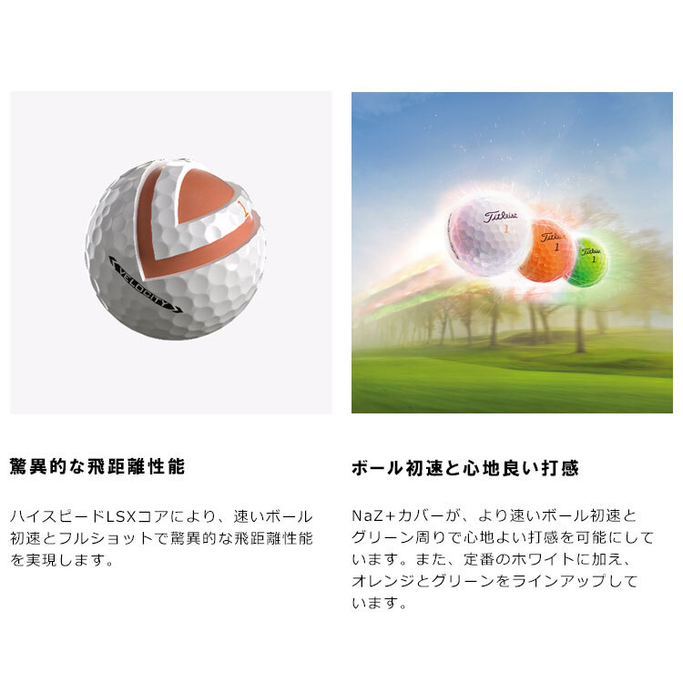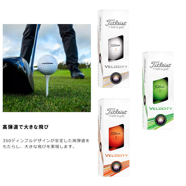 商品詳細 | ★ 品名:ベロシティ ★ 驚異的な飛距離性能 ★ ドライバー、ロングショットで低スピン ★ すべてのショットで高弾道 ★ グリーン周りで心地良い打感 ★ 価格:オープンプライス ★ 2ダースセット(グリーン 2ダース) | |