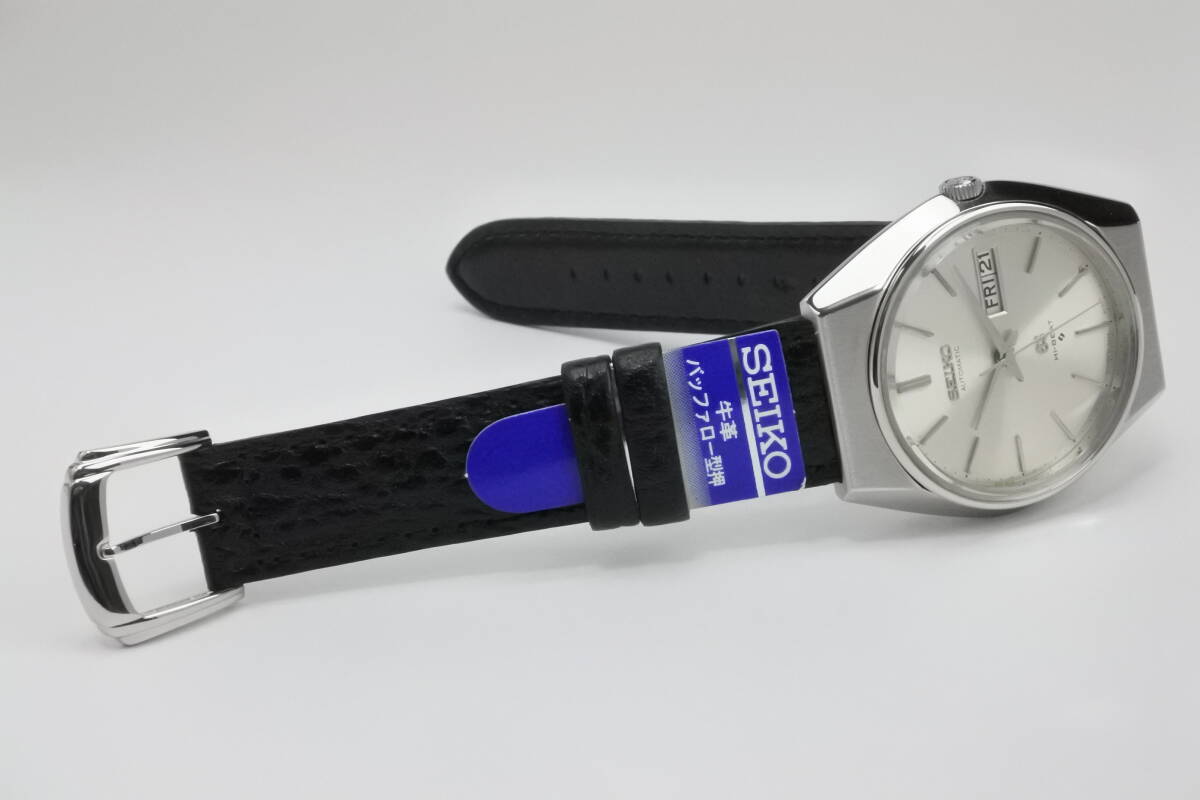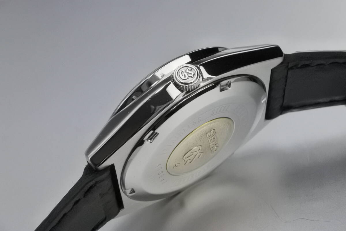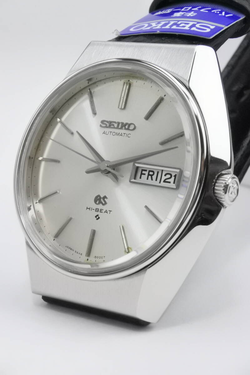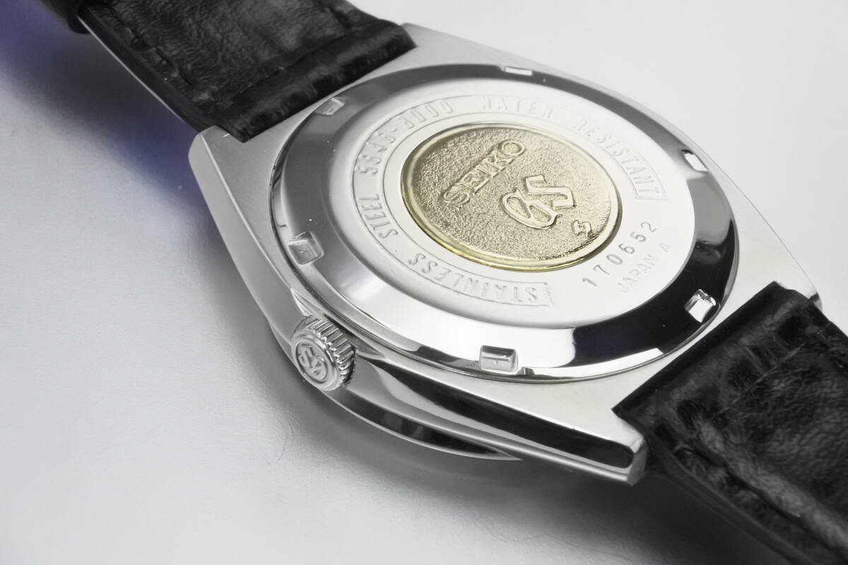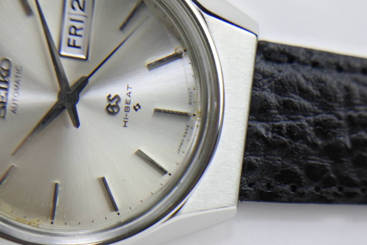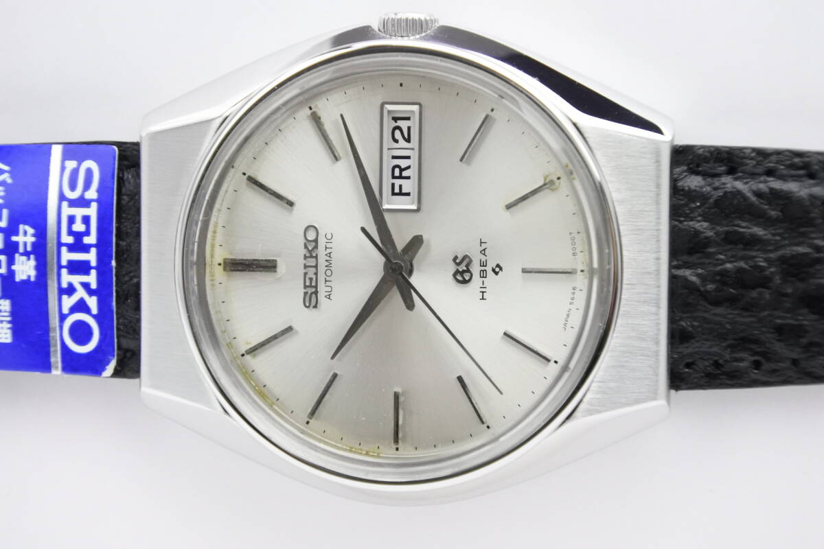 セイコーの最高級ライン「グランドセイコー」通称56GS・HI-BEATになります。グランドセイコー(GS)は、同社の誇る、最新技術を余すことなく結集して製造され、今日に至るまで国産時計の頂点に君臨し人気モデルを世に送り出してきました。このGSは、クオーツが製造・販売されだした1970年代の機械式の最後を飾る高級腕時計:56GSとして、当時の最新鋭技術に基づき製品化した名品であり、1970年から諏訪精工舎で製造が開始されました。搭載されているムーブメントは、HI-BEAT(8振動/28800bph)、曜日表示和英切替機能、日付(デイト)早送り機能、自動巻き、25Jewels、ハック(秒針停止機能)付のCal.8546A、過去の銘キャリバーの経験を生かした、精度と耐久性を両立させたキャリバーであり、機械式時計が全盛期だった頃の技術と魅力を余すことなく詰め込んだ時計になります。バーインデックスとアップライトの「SEIKO」と「GS」も輝きを失っておらず、セイコーらしい形状のハンズや3時位置のデイデイトなど、大変に引き締った印象の時計です。それに、同系の「7000」番ケースより希少な「8000」番ケースモデルであり、少し小振りな「セイコースタイル」といわている時計デザインを最も忠実に構築したといわれています。この機会に最高な時計をご検討頂ければ幸いです。