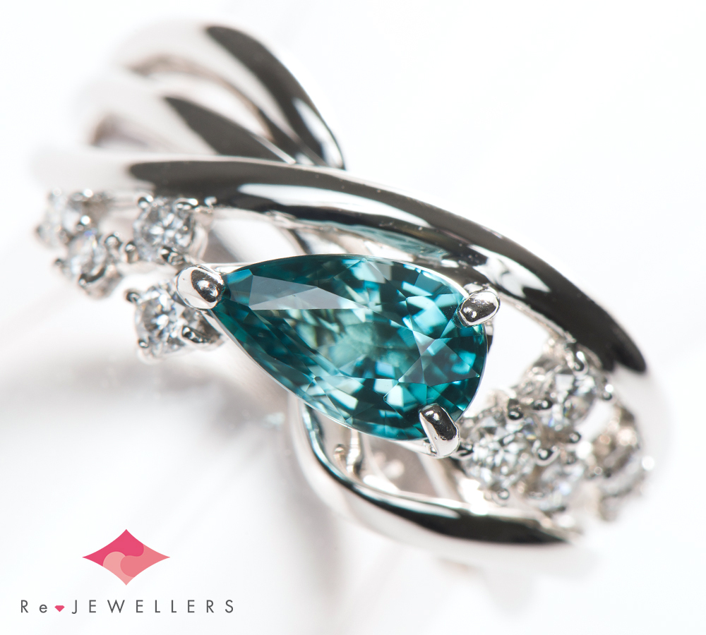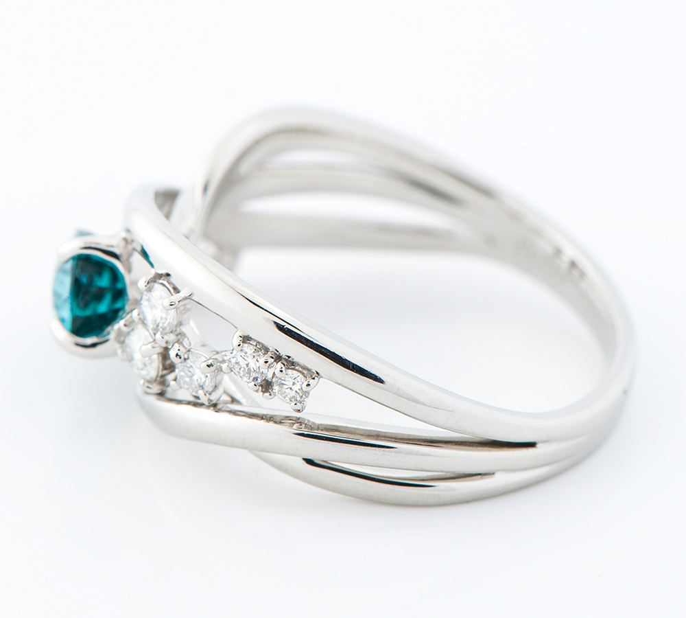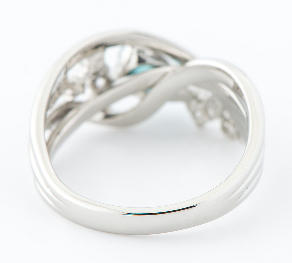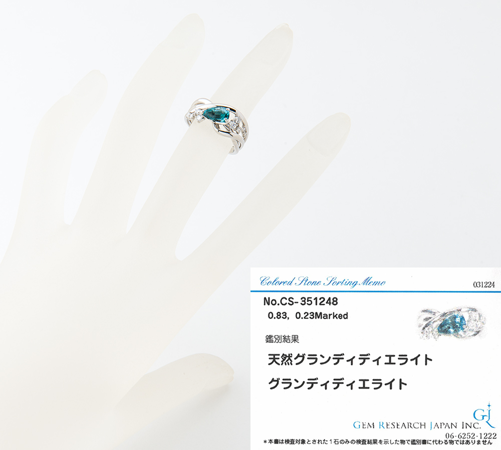 近年、非常に産出量の少ないレアストーンとして有名になりつつあるグランディディエライト0.83ctをセットしたリング。多色性により澄んだブルーグリーンカラーが、見る角度によって濃くなったり薄くなったりと様々な表情を見せてくれます。上品なペアシェイプにマッチした流れるようなアームのデザインに、ダイヤモンドが華やかさをプラス。人気の稀少石を気軽に楽しんでいただけるエレガントなジュエリーです。